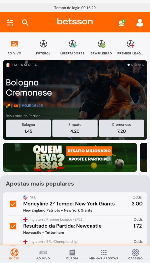 A Betsson costuma oferecer super odds em jogos grandes, e a navegação na área de futebol é muito fluida, tanto no app quanto no desktop.