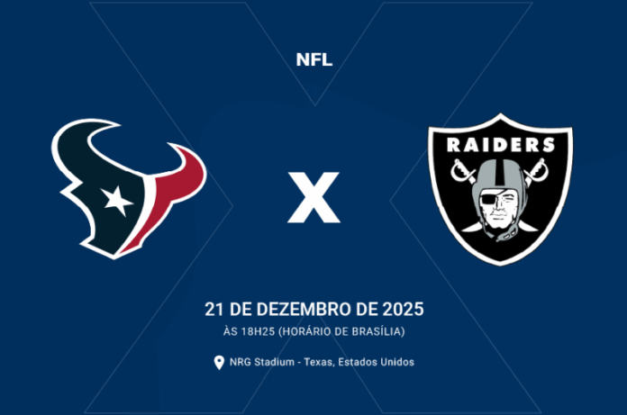 Houston Texans e Las Vegas Raiders jogam neste domingo, 21 de dezembro, às 18h35 (Brasília), pela Semana 16 da NFL 2025/26. O jogo está marcado para o NRG Stadium.