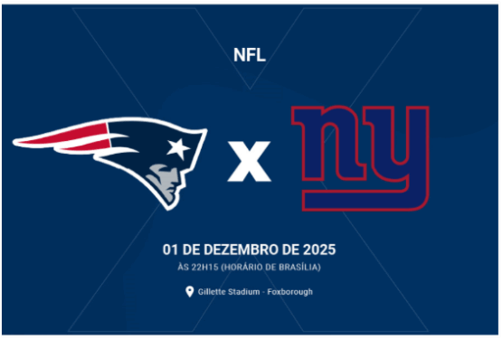 New England Patriots e New York Giants tem compromisso marcado nesta segunda-feira, 1º de dezembro, pela Semana 13 da NFL 2025. O jogo acontece no Gillette Stadium, às 22h15 (Brasília). Confira onde assistir, prognóstico e a melhor aposta.