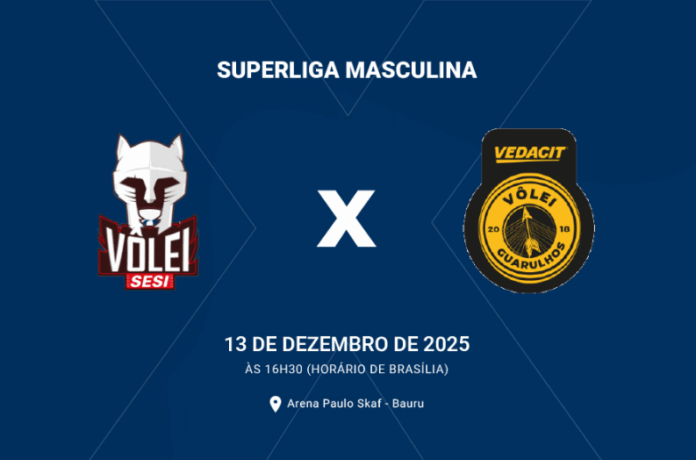 Sesi Bauru e Vôlei Guarulhos se enfrentam em confronto válido pela 10º rodada da Superliga Masculina de Vôlei 2025/26. O jogo está marcado para sábado, 13 de dezembro, às 18h30 (Brasília), na Arena Paulo Skaf, em Bauru-SP. Confira onde assistir, prognóstico e a melhor aposta.