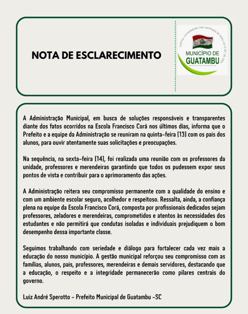 A Prefeitura de Guatambu divulgou uma nota de esclarecimento nesta sexta-feira (14) após encontros realizados com pais, professores e funcionários da Escola Francisco Corá. As reuniões ocorreram em meio a preocupações de famílias e relatos recentes que motivaram questionamentos sobre o ambiente escolar e a atuação da equipe da unidade.