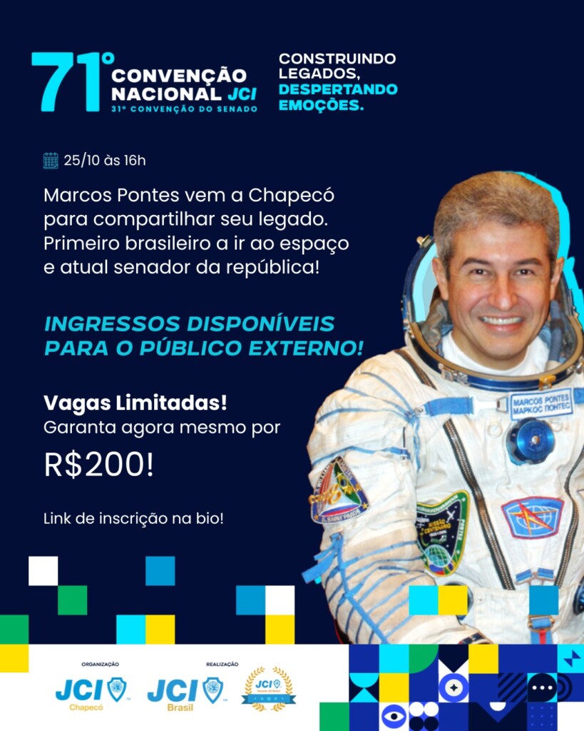 Chapecó será palco de um dos principais encontros de jovens líderes do país com a realização da 71ª Convenção Nacional da JCI Brasil, que acontecerá de 24 a 26 de outubro de 2025, no Centro de Eventos Plínio Arlindo de Nês. Entre os destaques da programação está a palestra do astronauta e senador Marcos Pontes, no dia 25 de outubro, às 16h.