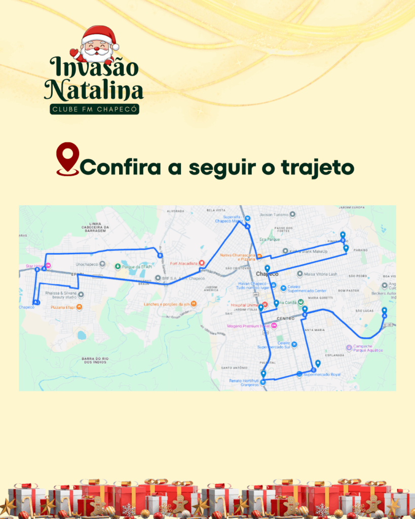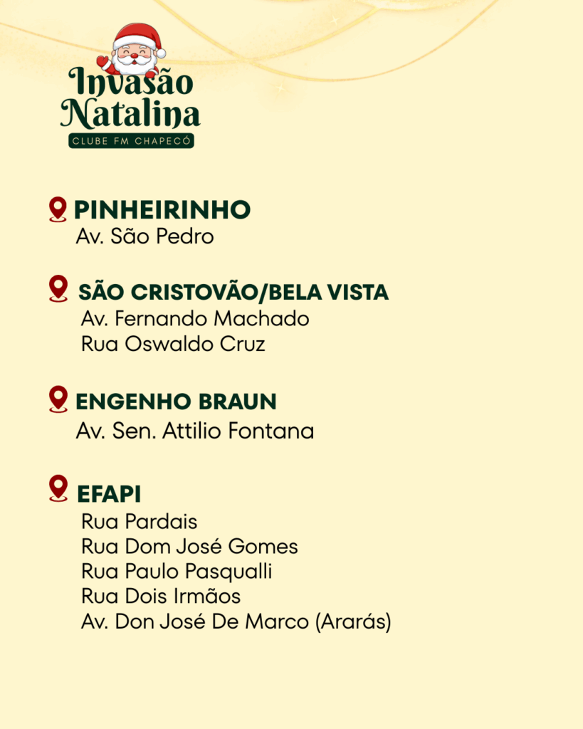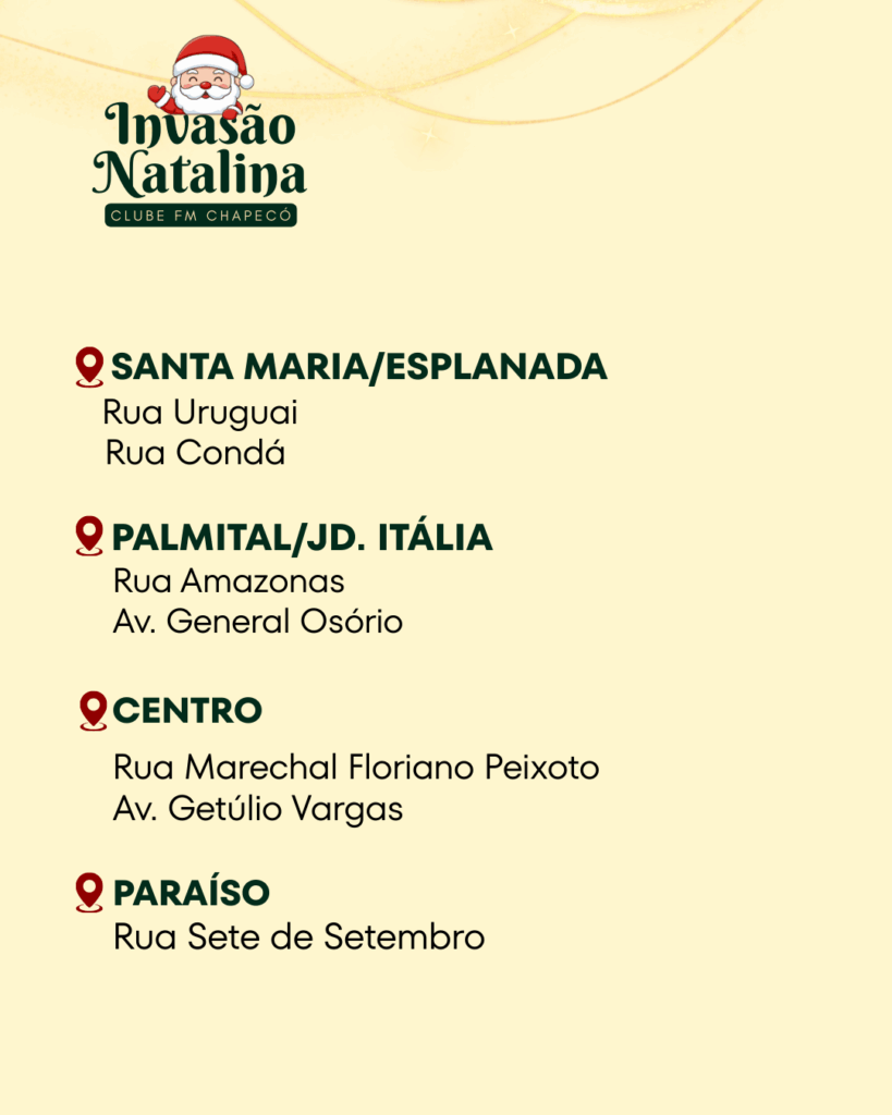 A magia do Natal vai tomar conta de Chapecó no sábado (20). A partir das 16h, a Clube FM Chapecó realizará a Invasão Natalina, uma ação especial que percorrerá diversos bairros da Capital do Oeste levando música, doces e muita alegria para crianças e famílias.