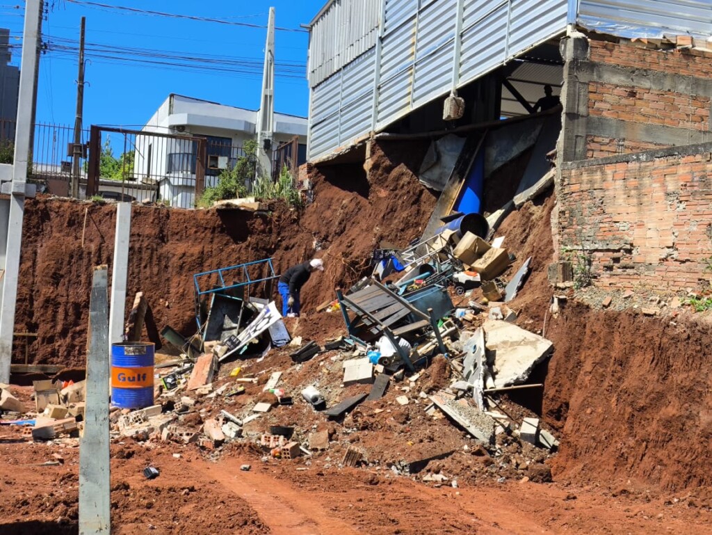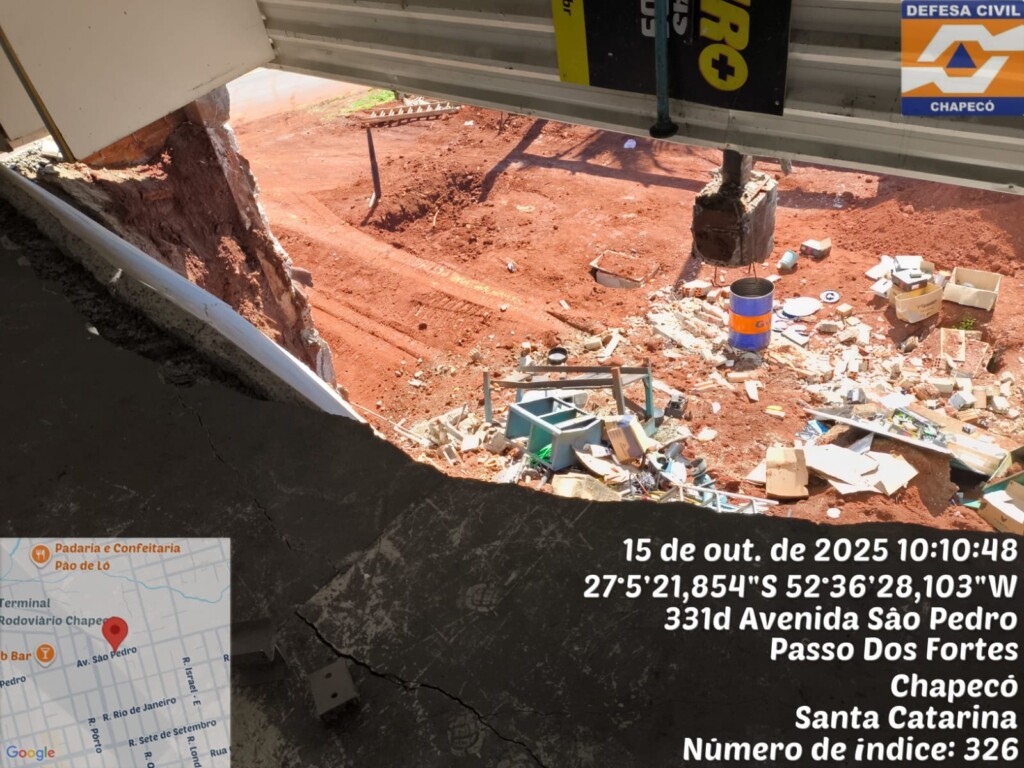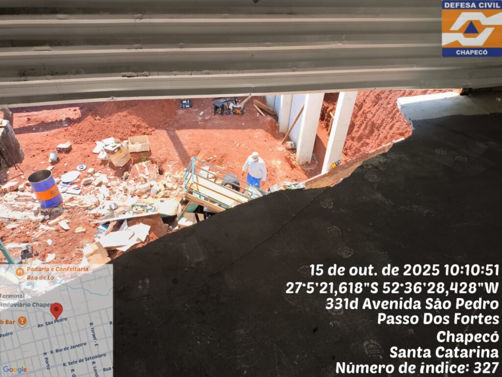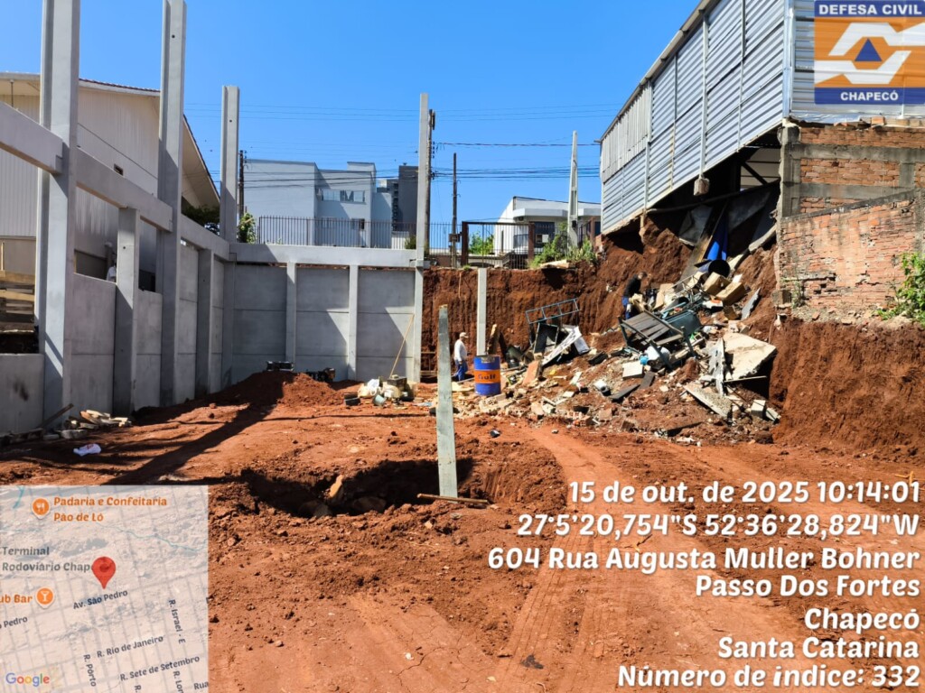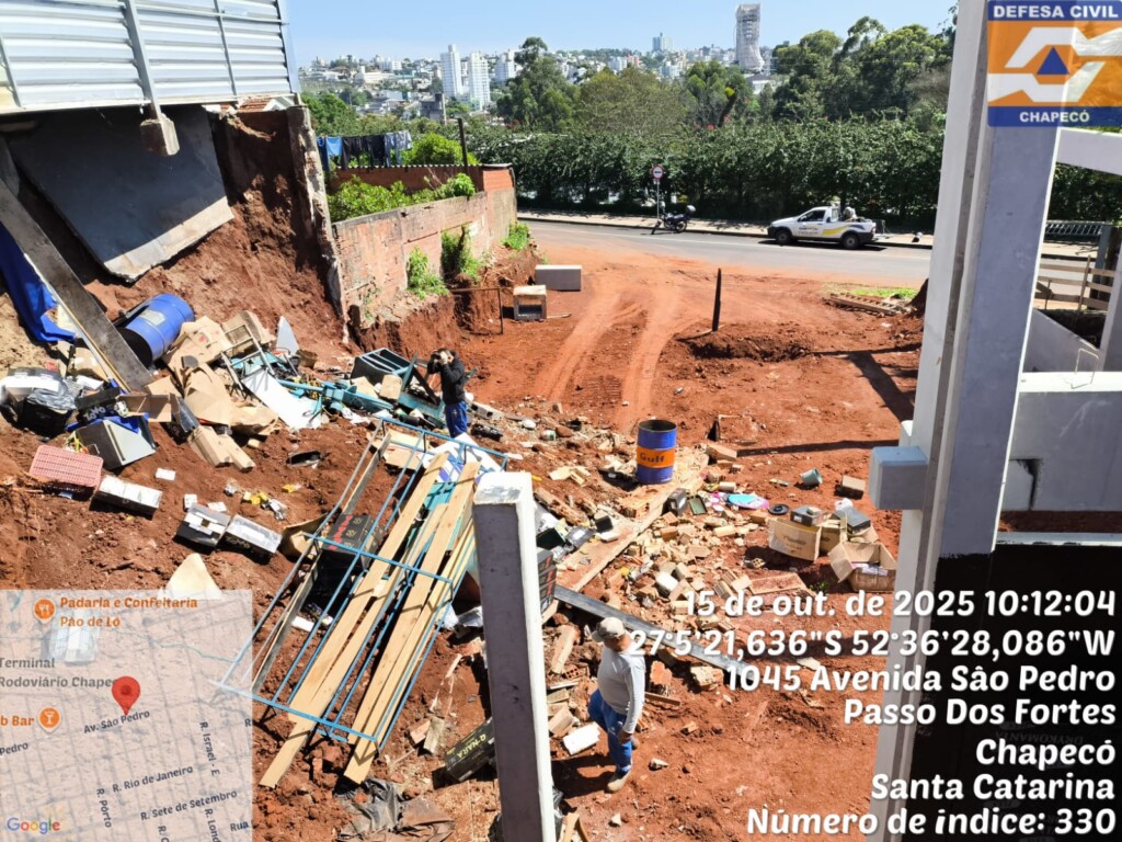 A Defesa Civil de Chapecó interditou cautelarmente, na manhã desta quarta-feira (15), uma área no bairro Passo dos Fortes após um deslizamento de solo comprometer estruturas no local. O incidente ocorreu na divisa entre propriedades, onde parte de um talude cedeu, arrastando materiais, entulhos e equipamentos para uma construção em andamento no nível inferior do terreno.