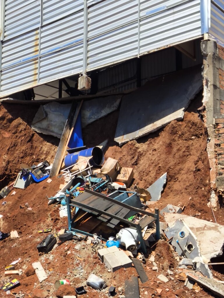 Durante vistoria técnica, foi constatado o colapso parcial de uma estrutura metálica localizada na parte superior da área afetada, além de risco iminente de novos deslizamentos. Diante da instabilidade da base de sustentação, a interdição foi determinada como medida preventiva.