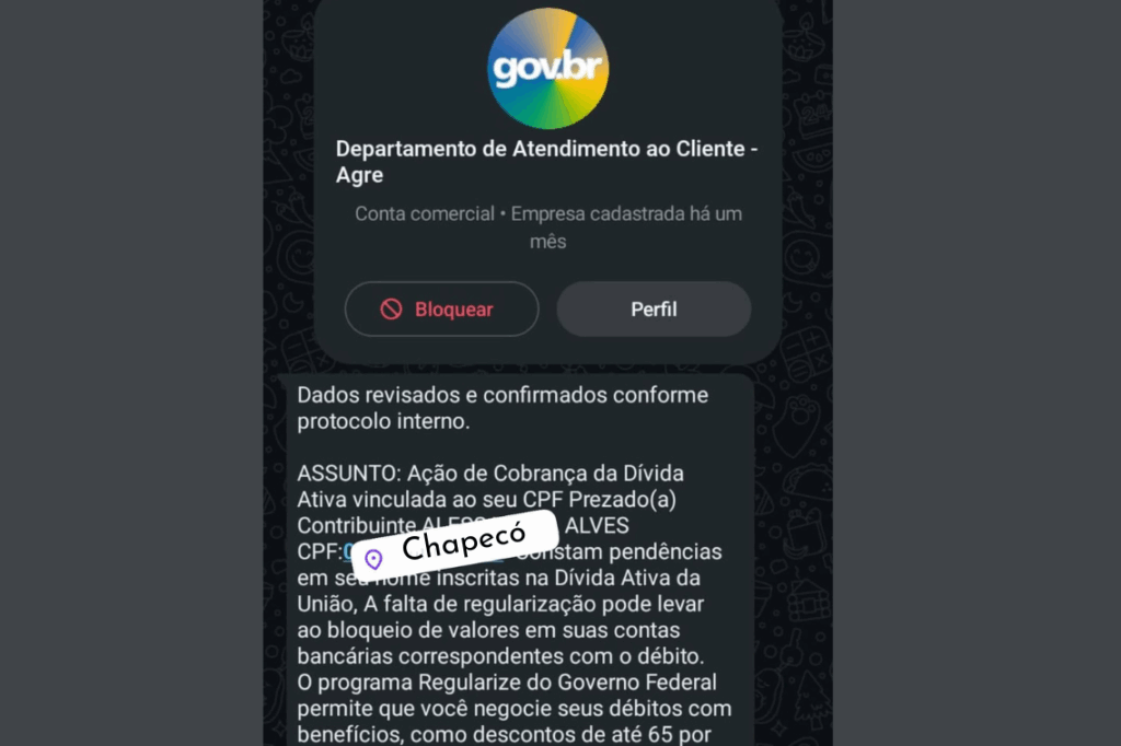 Mensagens que simulam cobranças oficiais do Governo Federal e alertam sobre suposta inscrição na Dívida Ativa da União estão circulando por WhatsApp e SMS. Segundo a Receita Federal e a Procuradoria-Geral da Fazenda Nacional (PGFN), trata-se de um golpe. Os órgãos reforçam que não realizam cobranças, nem enviam links ou boletos por aplicativos de mensagens.