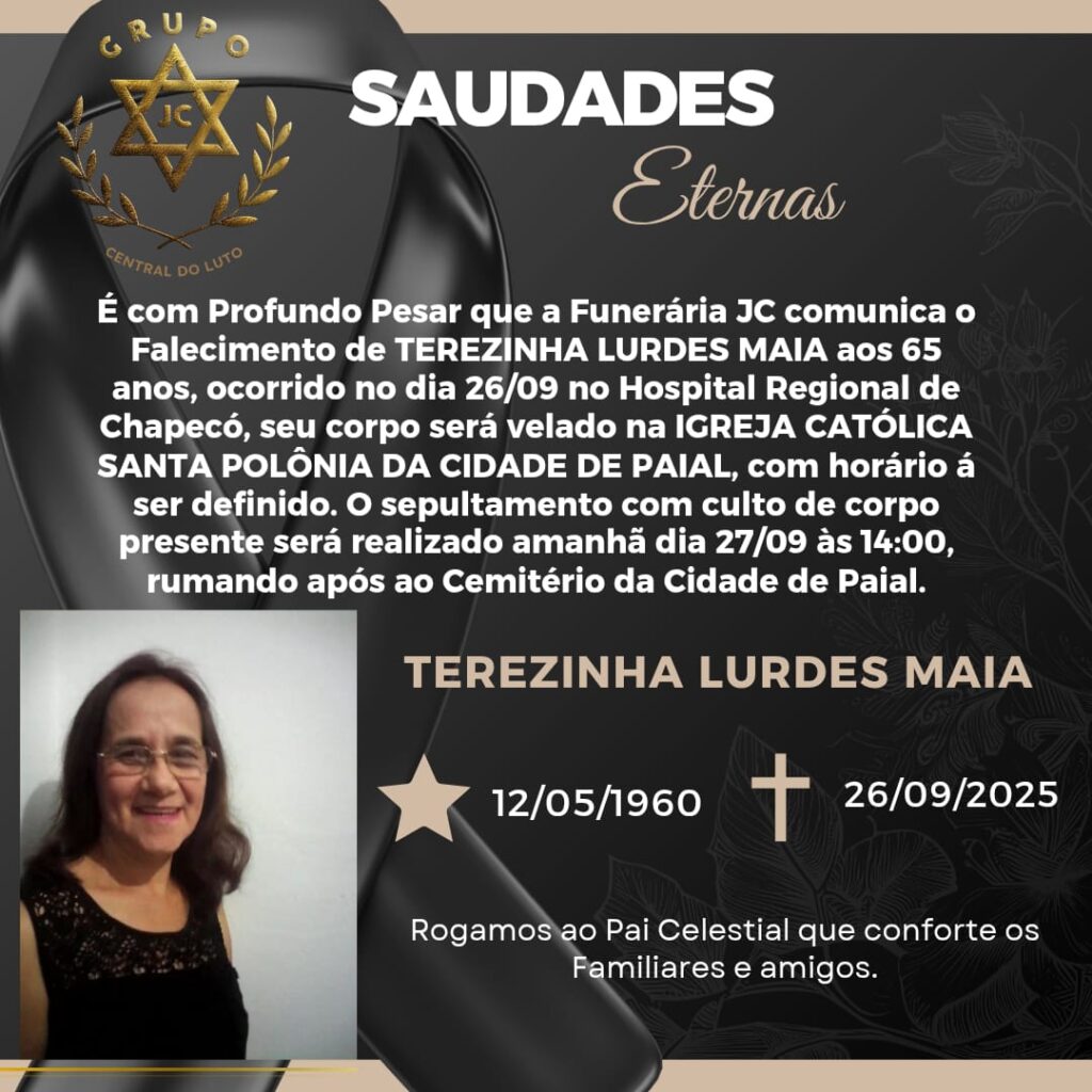 O corpo de Terezinha Lurdes Maia está sendo velado na Igreja Católica Santa Polônia, na cidade de Paial. A cerimônia de sepultamento será realizada no dia 27 de setembro, às 14h, no Cemitério Municipal de Paial.
