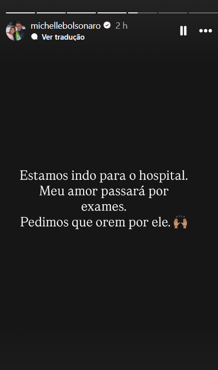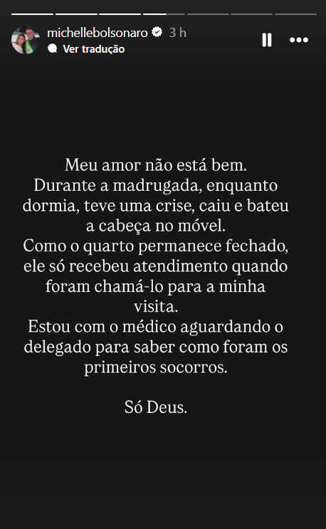 Segundo Michelle, o quarto onde Bolsonaro estava permaneceu fechado e o atendimento médico só ocorreu quando agentes foram chamá-lo para receber a visita dela, por volta das 9h. Em publicação nas redes sociais, ela afirmou que o ex-presidente “não está bem” e descreveu a queda como consequência da crise sofrida durante a madrugada.