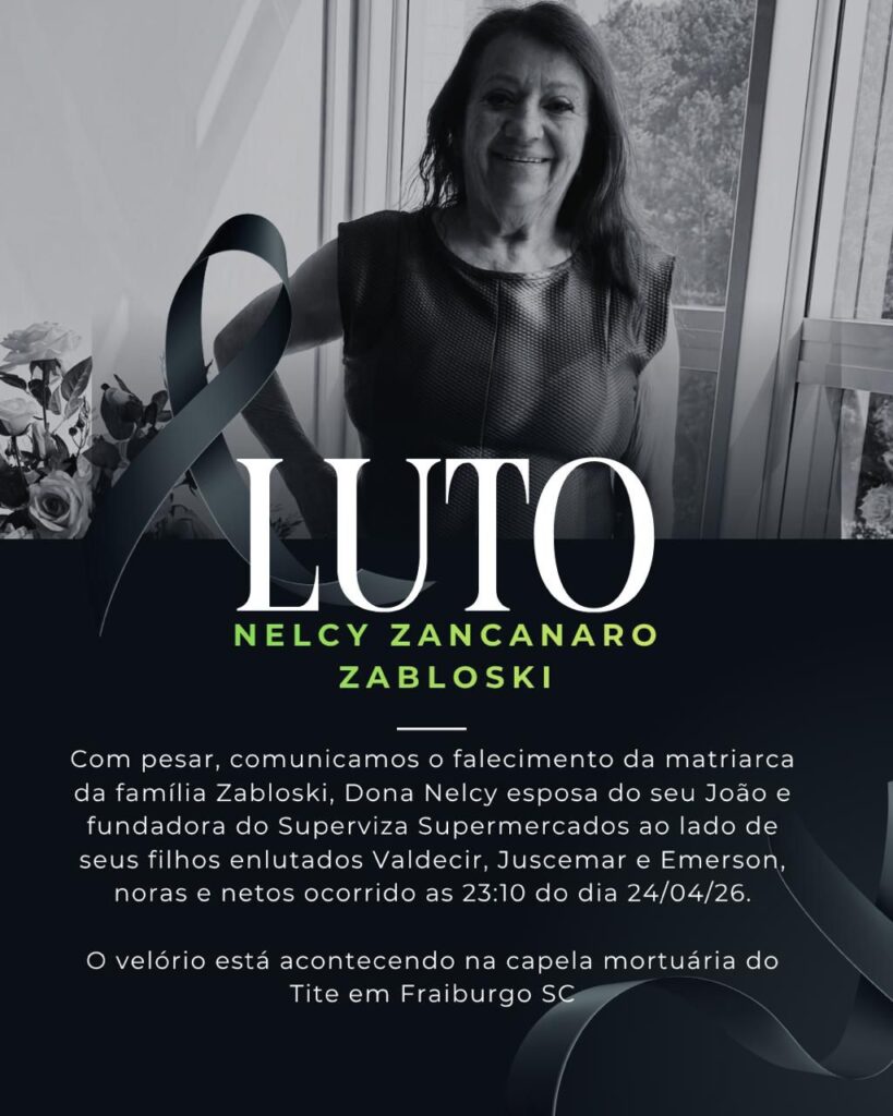 Faleceu na noite da última sexta-feira, 24 de abril de 2026, às 23h10, Nelcy Zancanaro Zabloski, matriarca da família Zabloski e fundadora do Superviza Supermercados. O velório está sendo realizado na capela mortuária do Tite, no município de Fraiburgo, em Santa Catarina.