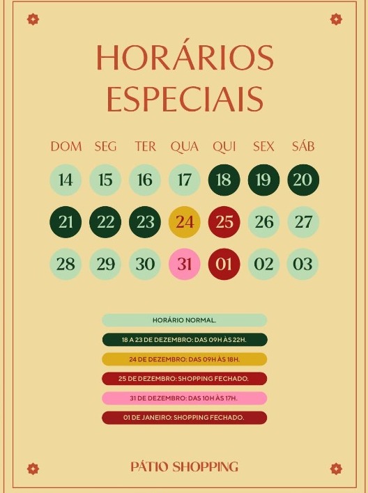 Entre os dias 26 e 30 de dezembro, o Pátio Shopping retoma o horário normal. Nos dias 26, 27, 29 e 30, o funcionamento será das 10h às 22h. No domingo, dia 28, a praça de alimentação e as operações de lazer e entretenimento atendem das 11h às 22h, enquanto as demais lojas funcionam das 13h às 20h.