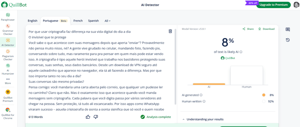 A boa notícia é que você não precisa ser nerd de tecnologia pra se proteger. A maioria dos apps que você usa já tem criptografia embutida – é só usar. Procura sempre o “https://” quando for comprar algo online. Usa apps de mensagem que prometem criptografia de ponta a ponta. E quando for usar Wi-Fi público, pensa duas vezes antes de acessar coisas sensíveis, ou usa alguma proteção extra.