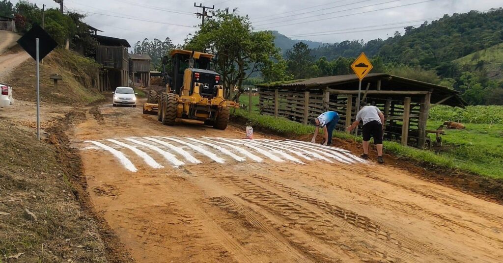 Uma faixa de pedestres pintada sobre uma lombada de barro virou assunto nas redes sociais e motivo de piadas em José Boiteux, no Alto Vale do Itajaí. As imagens, divulgadas pela própria prefeitura nesta terça-feira (4), mostram uma estrada sem pavimentação onde a estrutura foi construída e coberta com cal, simulando uma faixa de pedestres.
