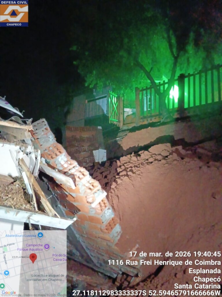 Uma família ficou desalojada após a queda de um muro sobre uma residência na noite desta terça-feira (17), em Chapecó, no Oeste de Santa Catarina. Segundo informações da Defesa Civil, o caso foi registrado por volta das 19h30, na rua Frei Henrique de Coimbra, no bairro Esplanada.