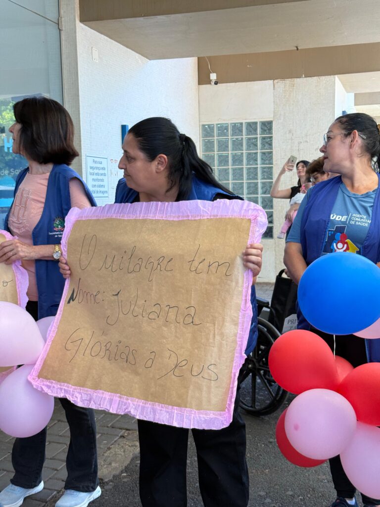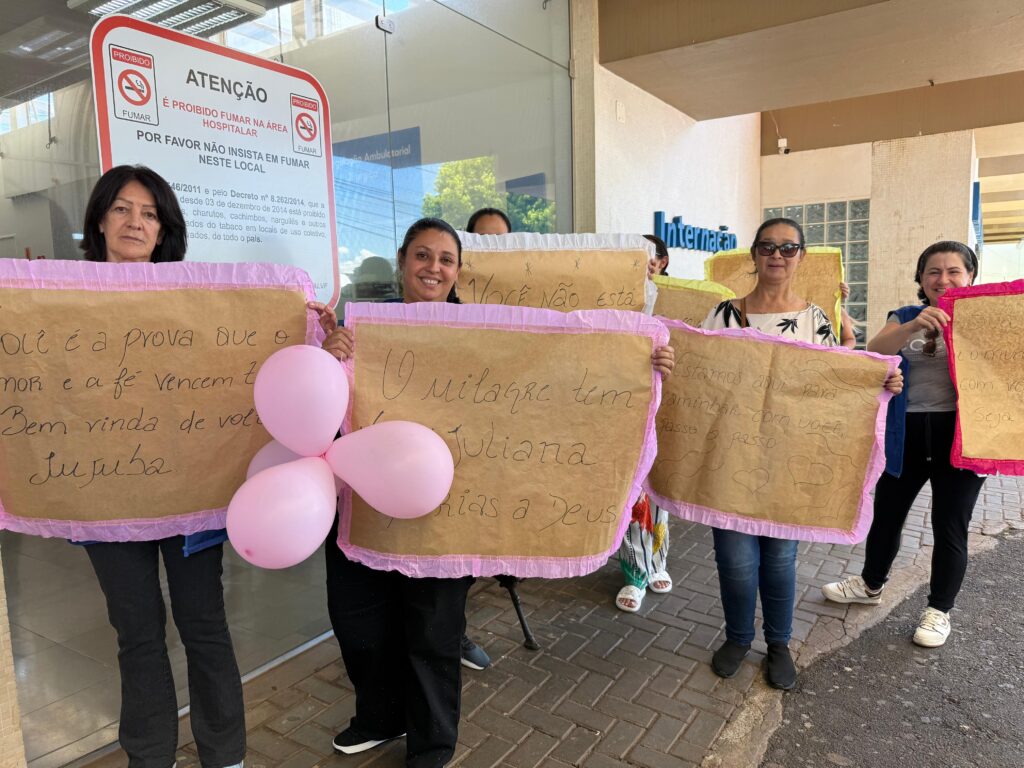 Na manhã desta quarta-feira (04), à frente da entrada principal do Hospital Regional do Oeste (HRO), um grupo de aproximadamente 25 pessoas se aglomerou com balões, cartazes, flores e sorrisos. O motivo era a alta de Juliana Scartezini, de 38 anos, vítima de um grave acidente envolvendo seu carro e um motorhome no dia 16 de novembro de 2025.