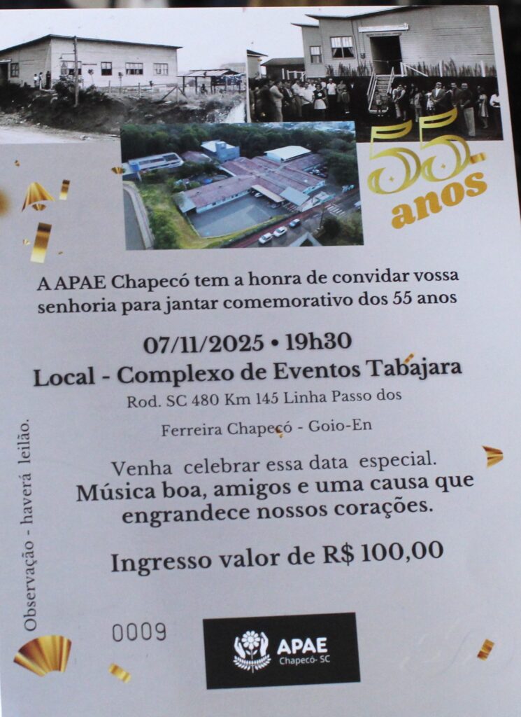 A Apae Chapecó se prepara para uma noite especial em comemoração aos 55 anos de história e inclusão. O jantar beneficente da instituição será realizado no dia 7 de novembro, a partir das 19h30, no Complexo de Eventos Tabajara, e promete unir solidariedade, cultura e música em um só evento.