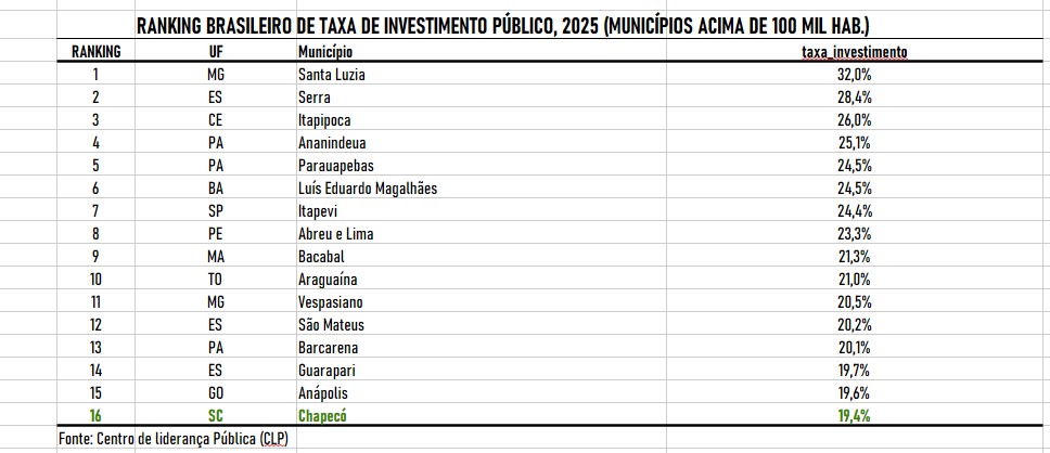 De acordo com dados do Centro de Liderança Pública, compilados pela Secretaria de Desenvolvimento Econômico, Turismo e Inovação, Chapecó lidera na região Sul e ocupa a 16ª posição no ranking nacional em percentual de investimentos, considerando cidades com mais de 100 mil habitantes. Os dados mais recentes foram divulgados em 2025, com base no exercício de 2024.