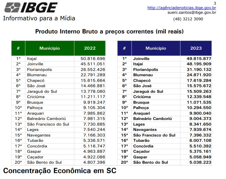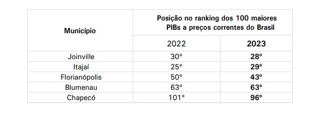 Chapecó ingressou na lista dos cem maiores PIBs do país, segundo dados divulgados nesta sexta-feira (19), pelo Instituto Brasileiro de Geografia e Estatística (IBGE). Os dados são relativos a 2023. Neste ano Produto Interno Bruto da maior cidade do Oeste chegou a R$ 17,6 bilhões, ficando na posição 96 no país e quinto em Santa Catarina, atrás apenas de Joinville, Itajaí, Florianópolis e Blumenau, que são cidades mais populosas. Em 2022 Chapecó estava na posição 101, com PIB de R$ 15,6 bilhões. Houve um aumento de R$ 2 bilhões em apenas um ano, num crescimento de 12%.