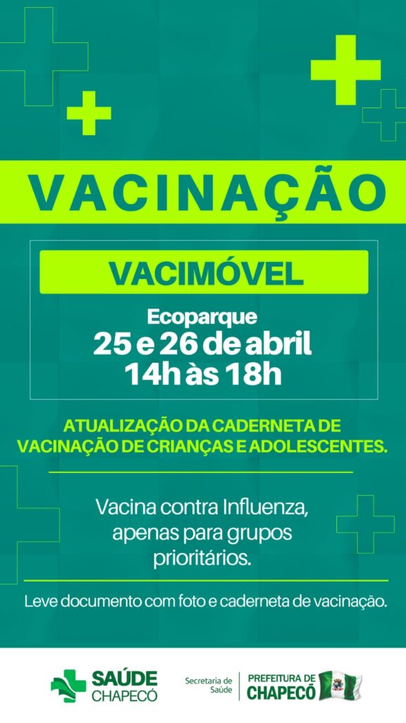A Secretaria Municipal de Saúde de Chapecó realiza neste fim de semana uma ação voltada essencialmente à atualização da caderneta de vacinação de crianças e adolescentes. A iniciativa ocorrerá no Ecoparque, em estrutura itinerante, nos dias 25, sábado, e 26, domingo, das 14h às 18h, sem necessidade de agendamento prévio.