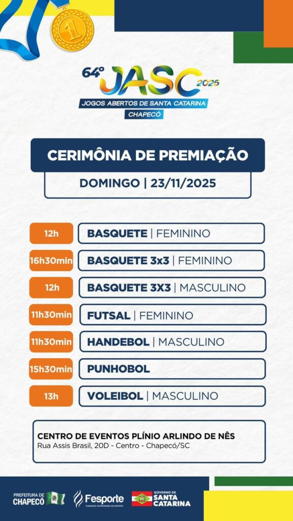- Voleibol Masculino: Superou São José por 3×0 na semifinal e confronta Blumenau às 11h no Ginásio Ivo Silveira.