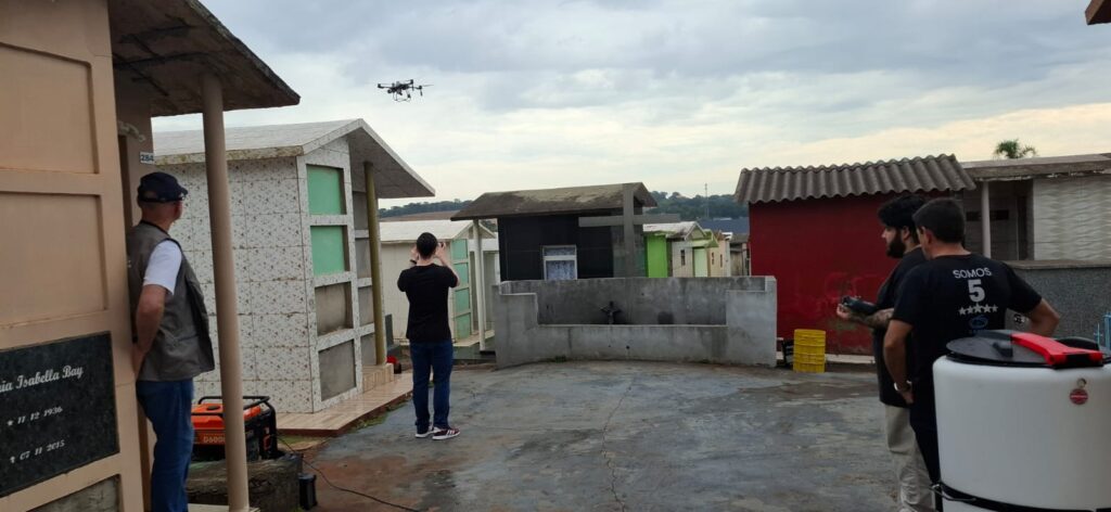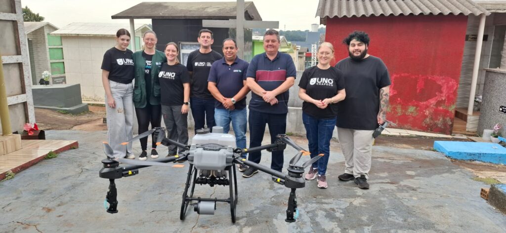 A aplicação do produto biológico foi realizada com o drone Agras T25, dentro de um projeto de pesquisa conduzido pela Unochapecó. A pós-doutora Maria Assunta Busato explicou que o objetivo é avaliar a eficiência do uso de veículos aéreos não tripulados no combate às larvas do mosquito.