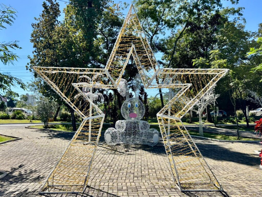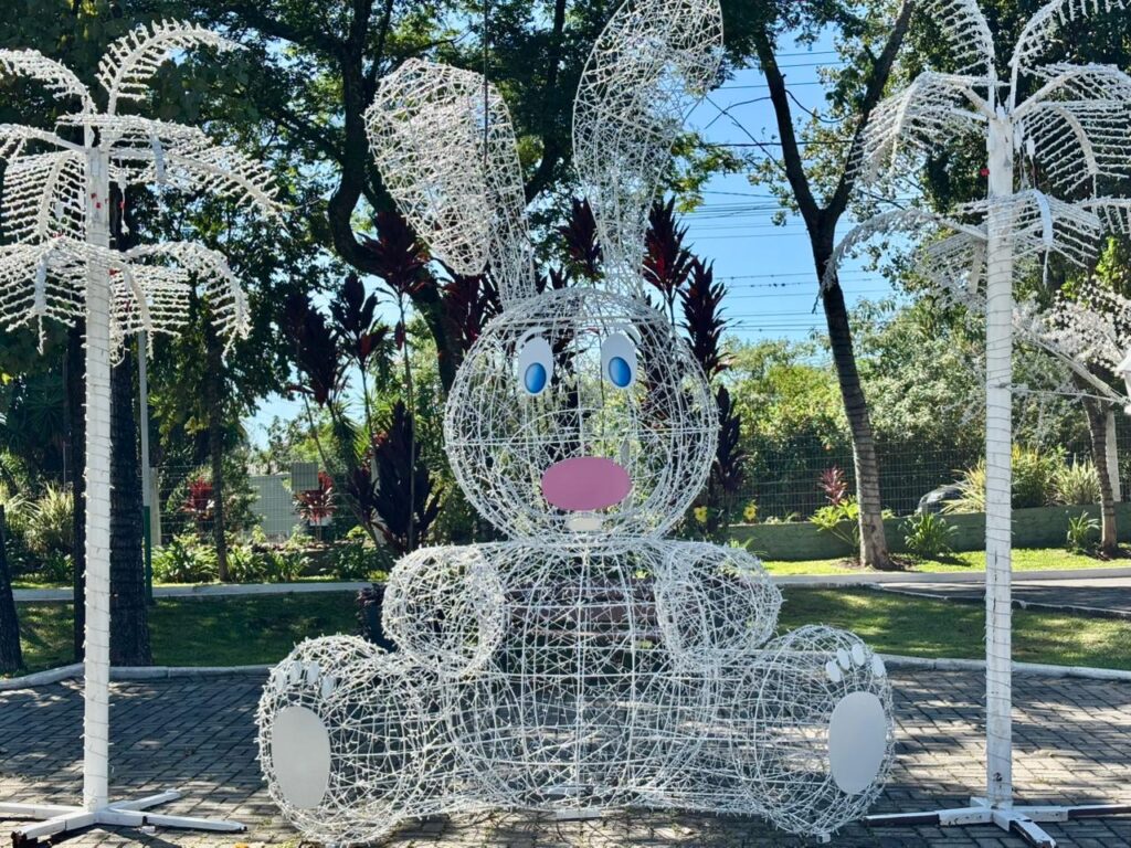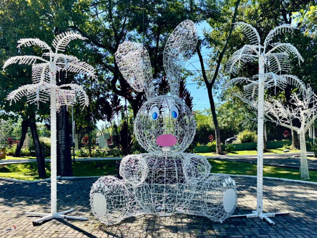 Entre as principais atrações está um coelho com cerca de quatro metros de altura, produzido com estrutura metálica e iluminação em LED. O espaço também conta com duas “Osterbaum”, conhecidas como árvores de Páscoa, decoradas com ovos confeccionados por artesãos do Programa Feito em Chapecó, vinculado à Secretaria de Cultura.
