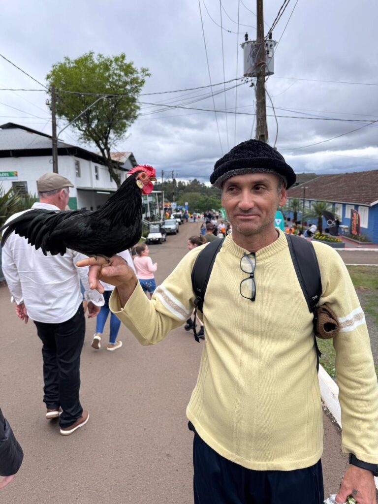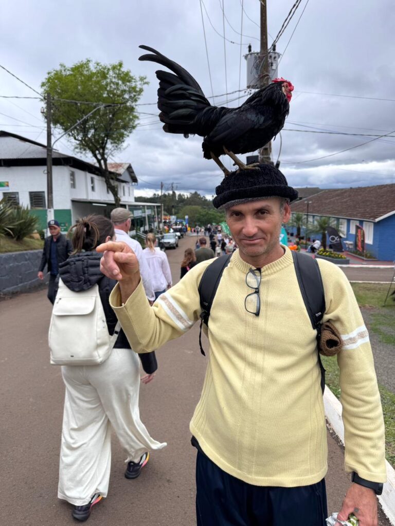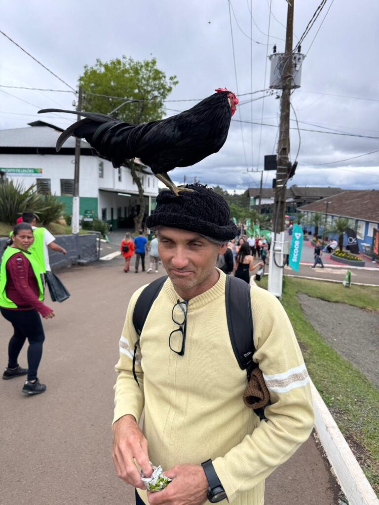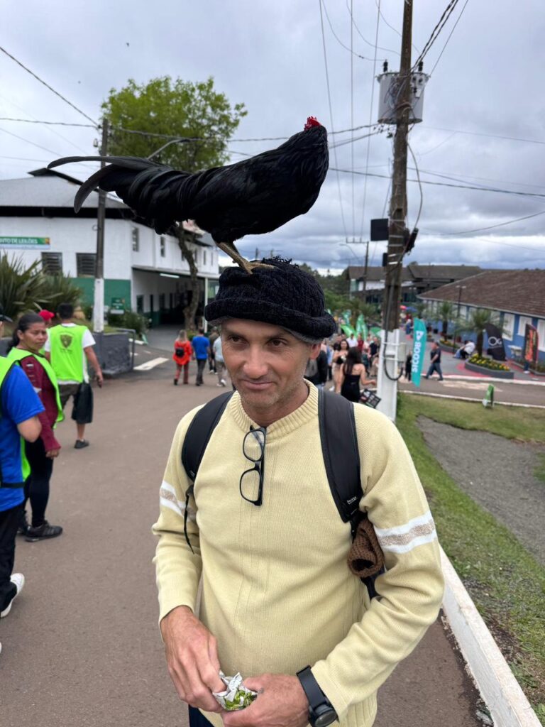 Ele aproveitou a manhã de sábado para visitar a Efapi do Brasil e conhecer as novidades apresentadas pelos expositores em diversas áreas. “A feira está muito bacana e organizada”, destaca Manuel. O que também chamou a atenção dos visitantes foi o próprio galo Solito. Segundo Laguna, ele tem oito meses e é tratado como um pet. “Ele come ração de aves e galinhas, tem o lugar dele para dormir, mas anda direto comigo — no banco, na lotérica, no supermercado”, explica.
