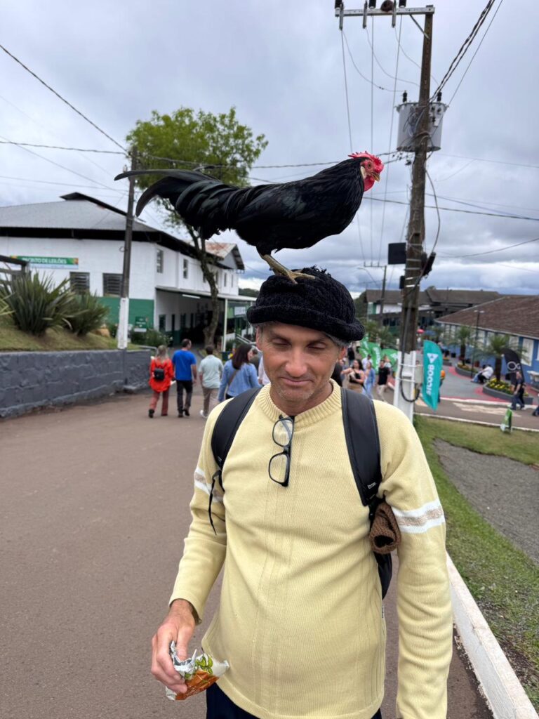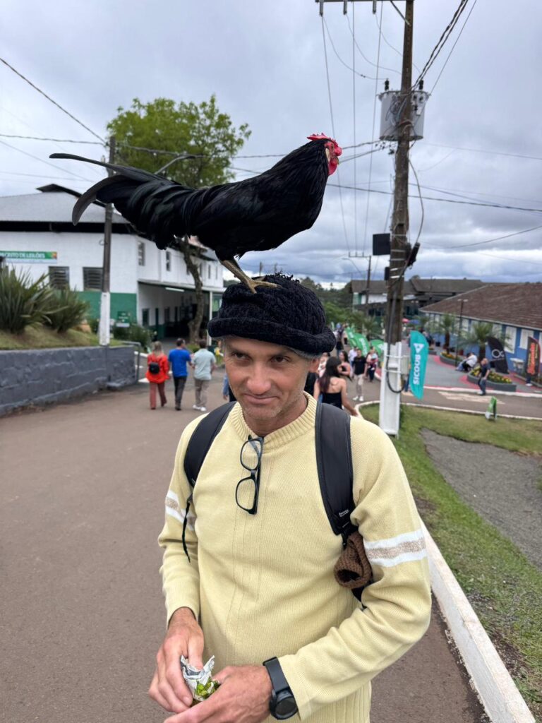 Quem passou pelo Parque Dr. Valmor Ernesto Lunardi, na manhã deste sábado (18), encontrou um visitante inusitado: o galo Solito, companheiro do venezuelano Manuel Laguna, morador do bairro Santo Antônio, em Chapecó. Manuel vive na Capital do Oeste há três anos e trabalha com práticas alternativas voltadas ao cuidado da saúde.