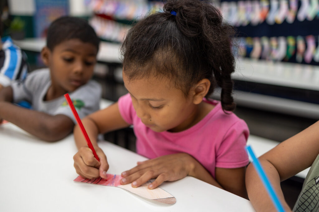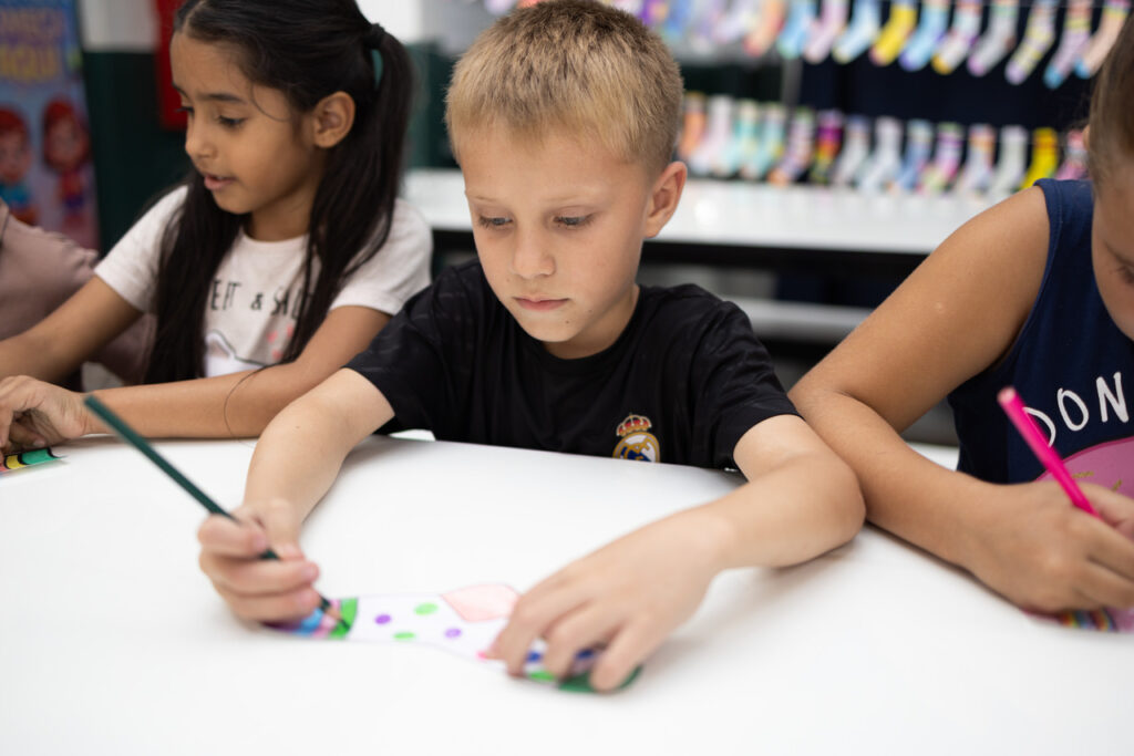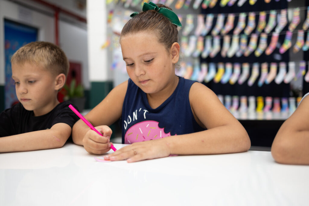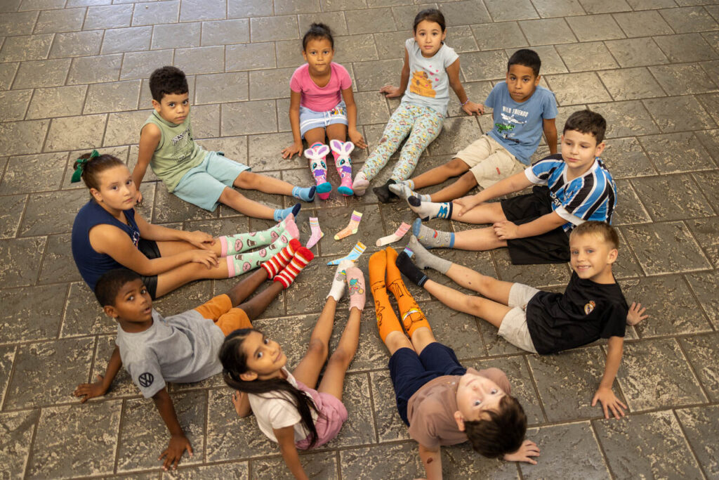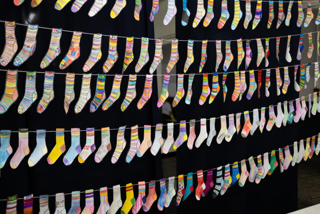 Na EBM Fedelino Machado dos Santos, no bairro Efapi, os alunos participaram de uma ação criativa, pintando meias que foram transformadas em um mural com mensagens de carinho, afeto e valorização da diversidade.