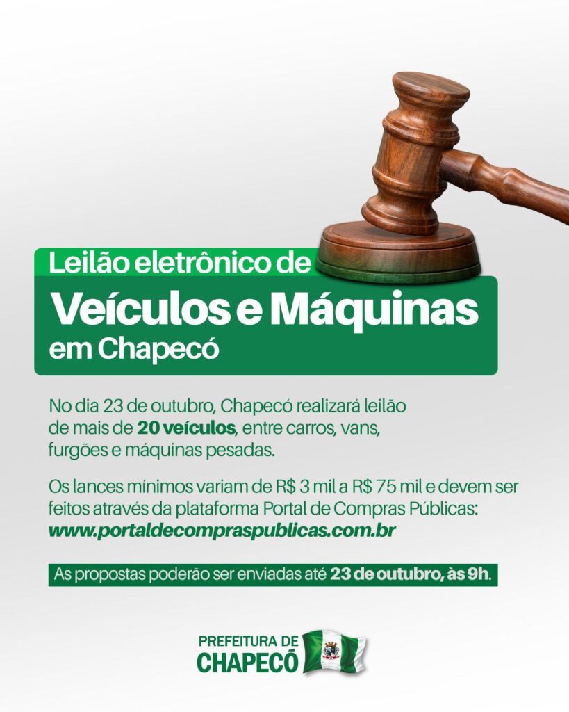 A Prefeitura de Chapecó está realizando um leilão eletrônico de veículos e bens móveis inservíveis, com mais de 20 itens disponíveis, incluindo automóveis, vans, furgões, trator de esteira, retroescavadeira, carregadeira, rolo vibratório e motoniveladora. Os lances mínimos variam entre R$ 3 mil e R$ 75 mil.