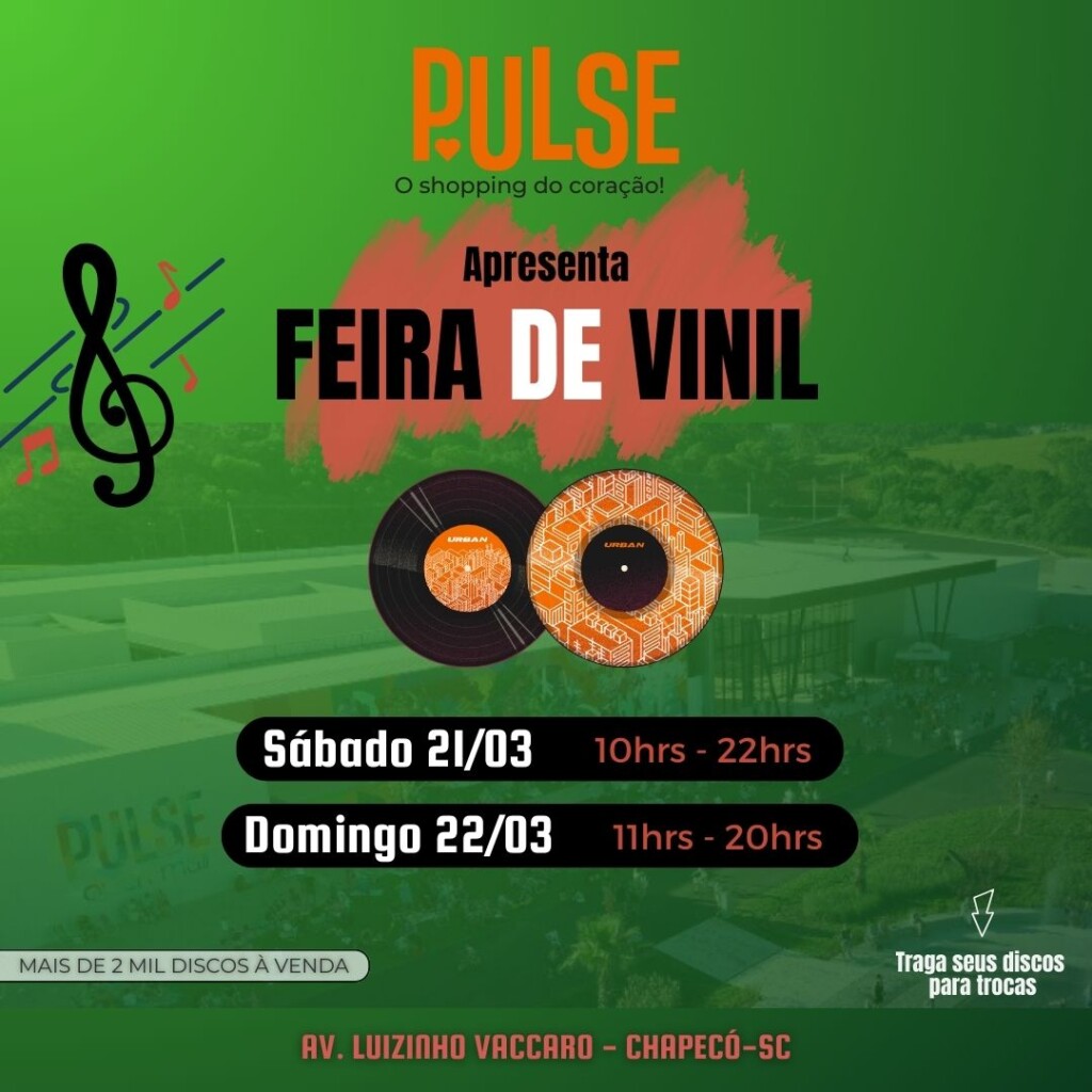 Chapecó recebe nos dias 21 e 22 de março a primeira edição da Feira de Vinil no Pulse Open Mall, reunindo mais de 2 mil discos disponíveis para venda entre LPs e CDs, novos e usados, nacionais e importados. O evento acontece durante o horário de atendimento do shopping e promete atrair colecionadores, apaixonados por música e curiosos que desejam conhecer ou ampliar suas coleções.