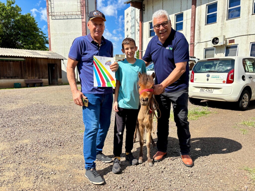 Foi entregue na manhã desta terça-feira (4) o mini-horse sorteado durante a Efapi do Brasil 2025, realizada de 10 a 19 de outubro, no Parque de Exposições Dr. Valmor Ernesto Lunardi, em Chapecó. O vencedor do sorteio online foi Ademir Gilioli, morador do município, que concorreu com o número 1.069. O animal, batizado de Valente, ficará em um sítio da família na cidade de Guatambu.