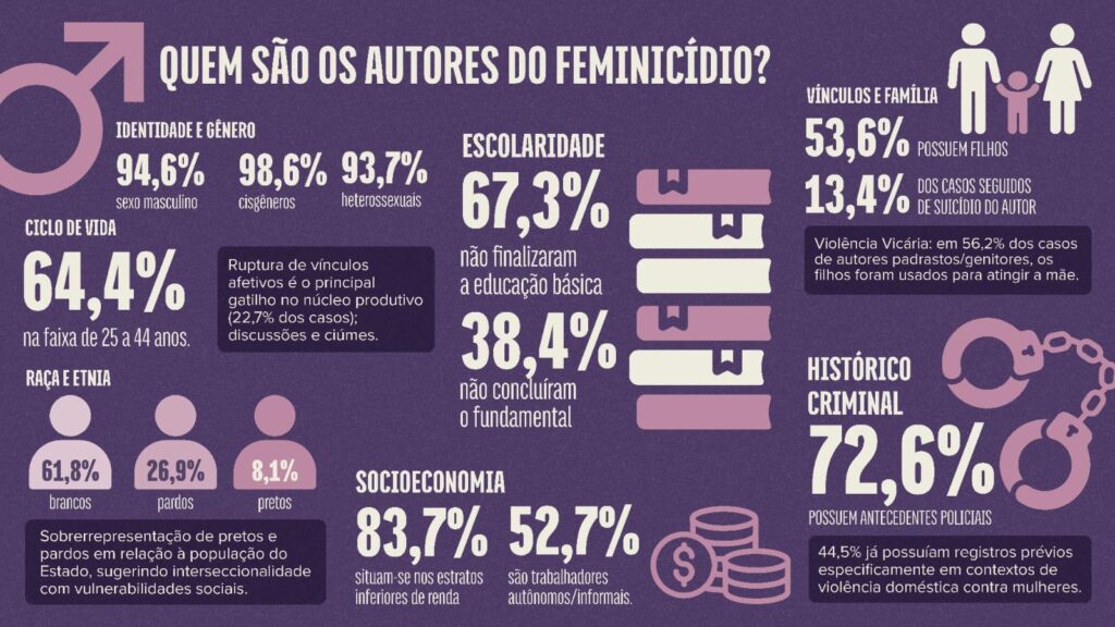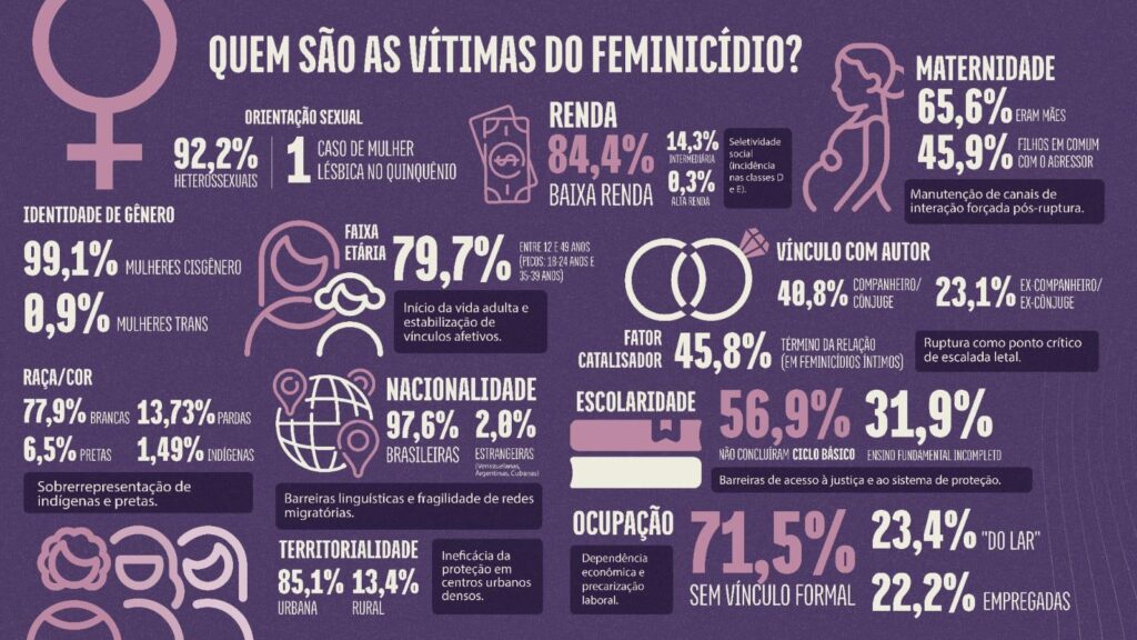 O Mapa também evidencia, segundo a Coordenadora-Geral do Neavit, a sobreposição entre vulnerabilidade territorial e social das vítimas. Embora o feminicídio seja um fenômeno que atravessa todas as classes sociais, os dados revelam que ele atinge de forma mais intensa mulheres que estão na base da pirâmide socioeconômica, com renda familiar per capita de até cinco salários mínimos, baixa escolaridade, muitas sem conclusão do ensino fundamental, e inseridas em contextos de precarização do trabalho, majoritariamente sem vínculo formal.