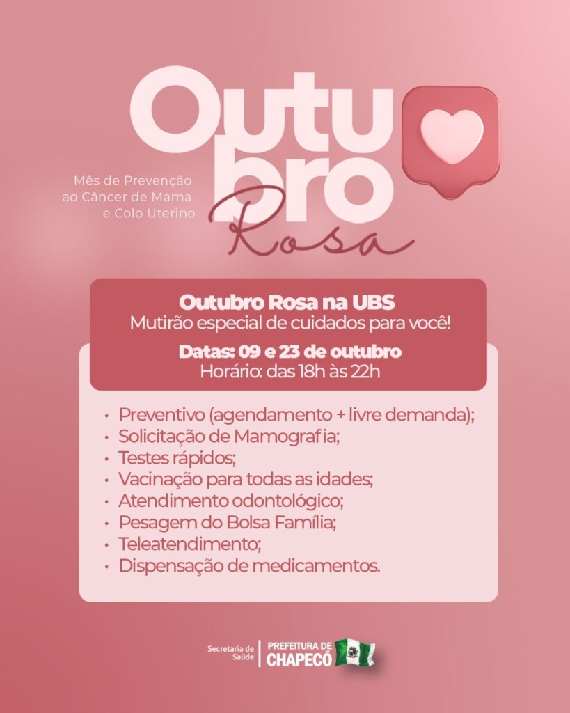 A Secretaria de Saúde de Chapecó organiza uma série de ações para marcar o Outubro Rosa, mês dedicado à conscientização sobre a prevenção e o diagnóstico precoce do câncer de mama e do câncer de colo do útero. Todas as 27 unidades básicas do município estarão envolvidas nas atividades ao longo do mês, com destaque para dois dias de atendimento em horário estendido: 09 e 23 de outubro, das 18h às 22h, além do horário normal.