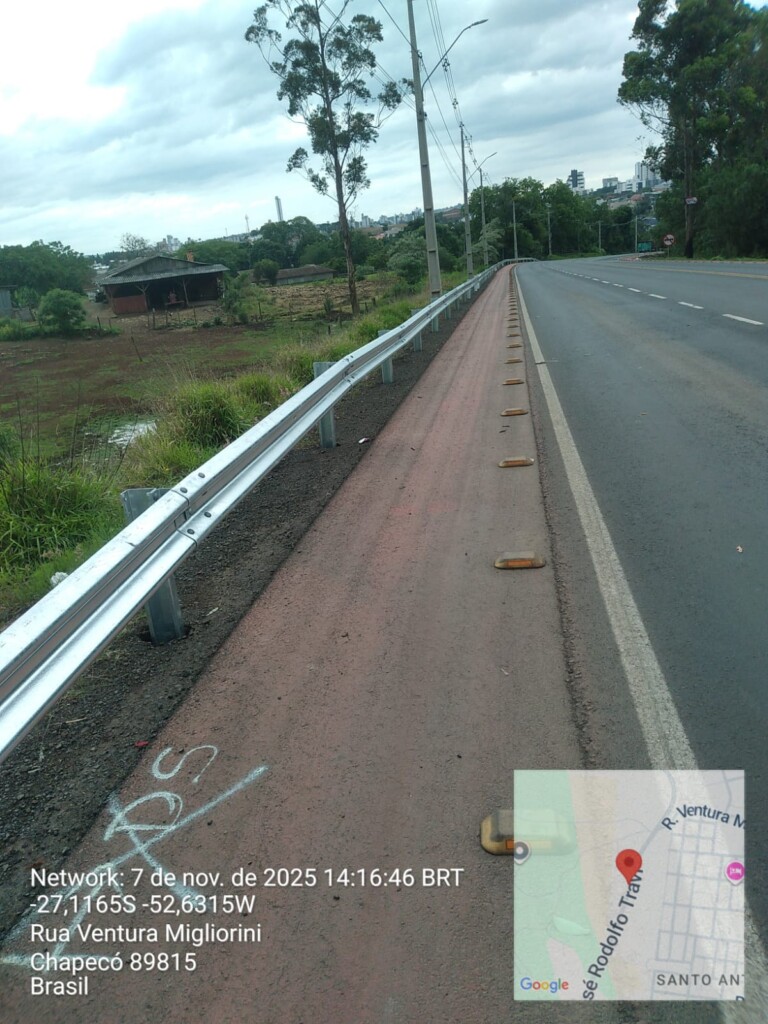 A Prefeitura de Chapecó instalou cerca de dois mil metros de defensas metálicas nos últimos meses para reforçar a segurança nas vias do município. O investimento total nas melhorias foi de R$ 450 mil. Os trabalhos incluíram a ancoragem de dispositivos de segurança, a restauração de defensas danificadas em pontos onde ocorreram acidentes e a implantação de novas barreiras protetivas. As intervenções foram concentradas principalmente no Contorno Viário Oeste e no Contorno Viário Extremo Oeste.