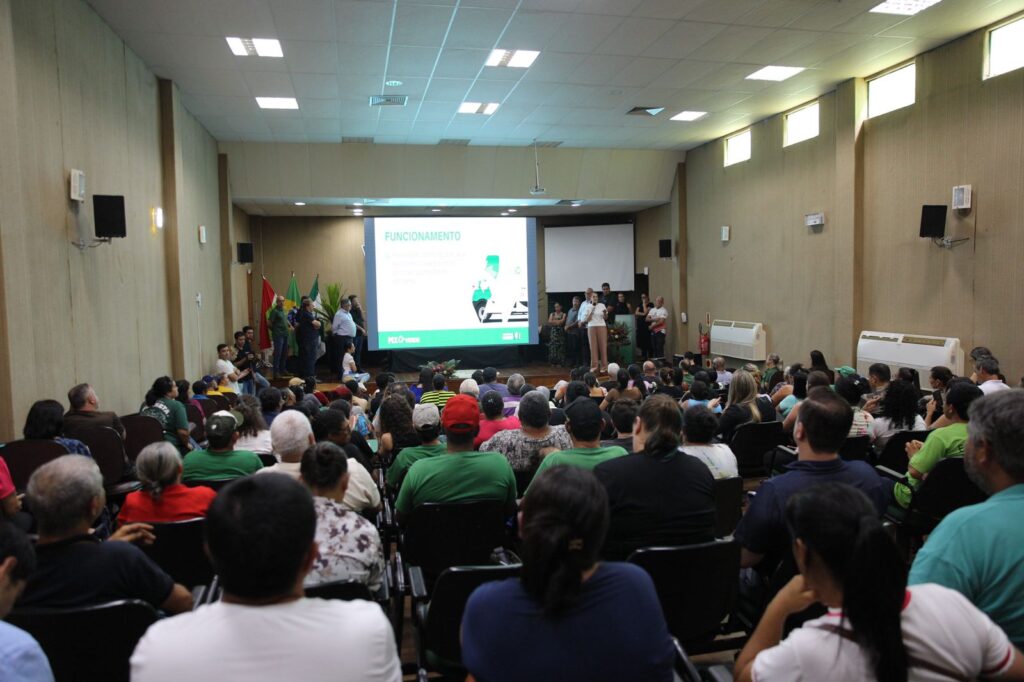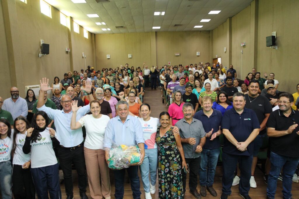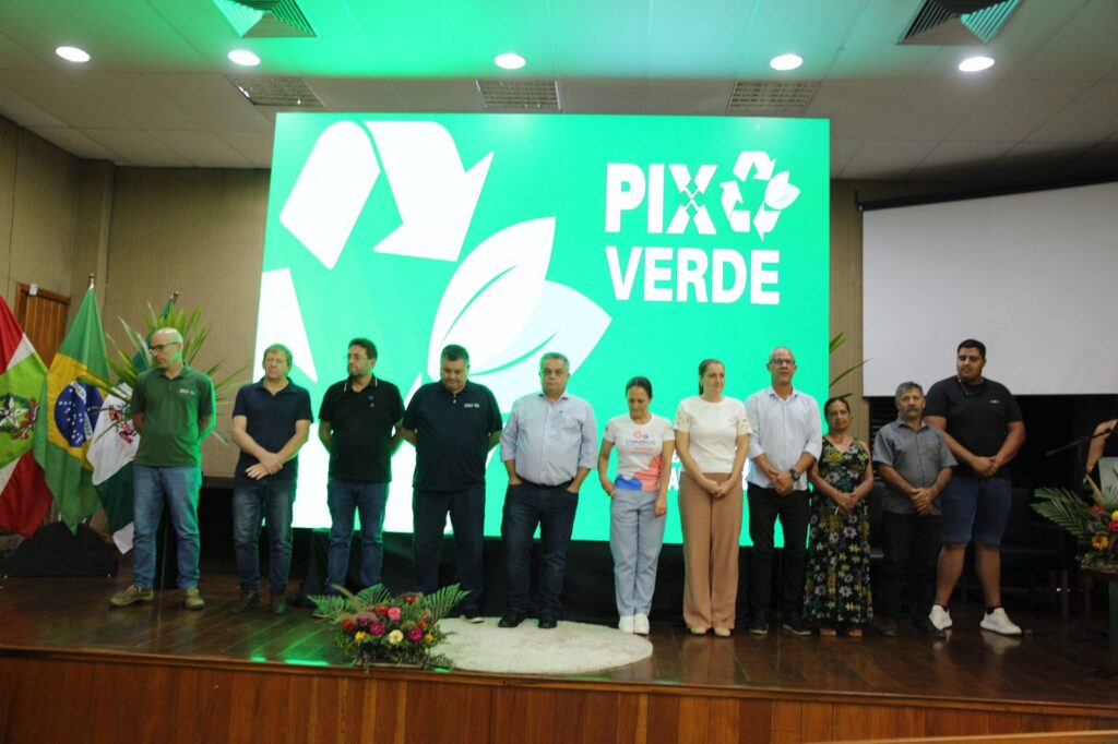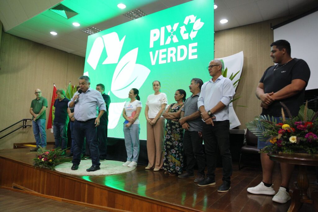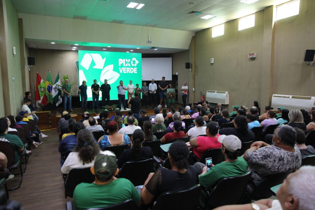 A Prefeitura de Chapecó lançou nesta segunda-feira (23) o Pix Verde, projeto de sustentabilidade, limpeza urbana e segurança alimentar, em que moradores vão trocar os resíduos por um valor em pix e também uma cesta de alimentos da agricultura familiar. O ato foi no auditório da Prefeitura com a participação de cerca de 150 pessoas entre representantes da Prefeitura, Polícia Ambiental, ONGs, catadores, agricultores e moradores das comunidades beneficiadas.