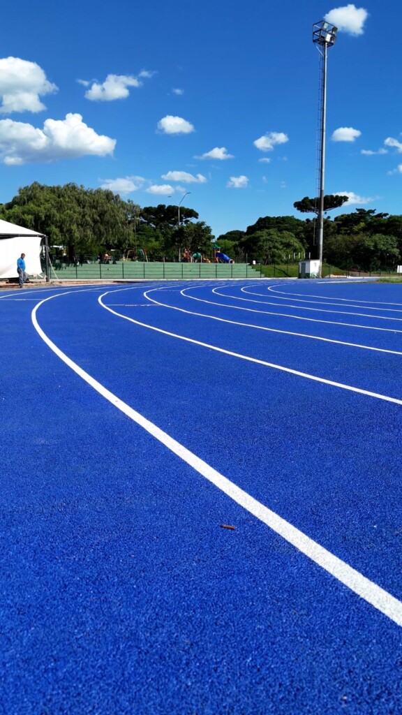 A pista possui 10 metros de largura, com uma base inicial de 10 centímetros de concreto, seguida pela aplicação de borracha misturada com cola e uma camada de resina antes da pintura final. O material utilizado é borracha SBR, amplamente empregada em pistas de alto rendimento por sua resistência, amortecimento e absorção de impacto. Além disso, o complexo recebeu piso de borracha nas áreas de aquecimento, lançamento de dardo, salto em altura e zona de arremessos.