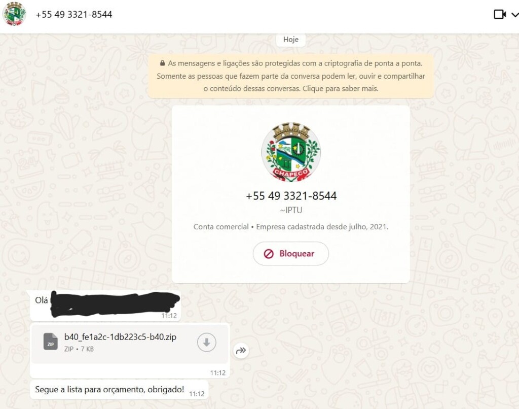 A Gerência de Tributos Imobiliários da Prefeitura de Chapecó emitiu um alerta na manhã desta quinta-feira (23) após o número de WhatsApp (49) 3321-8544 ter sido clonado. Segundo o comunicado oficial, moradores que receberem mensagens desse contato não devem abrir arquivos enviados nem fazer o download de nenhum conteúdo, para evitar riscos de golpes e fraudes.