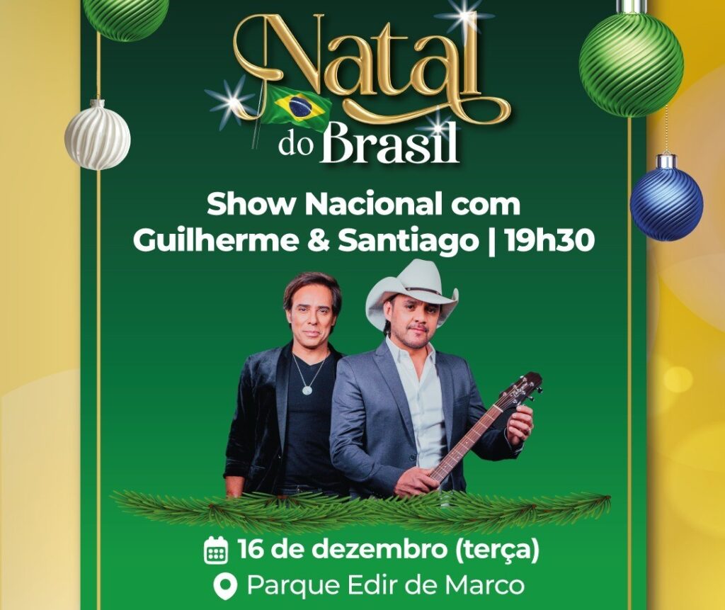 Está confirmado para esta terça-feira (16) o show da dupla sertaneja Guilherme e Santiago no Parque Edir de Marco, em Chapecó, como parte da programação do Natal do Brasil. A apresentação é uma das atrações mais aguardadas da programação natalina na cidade.