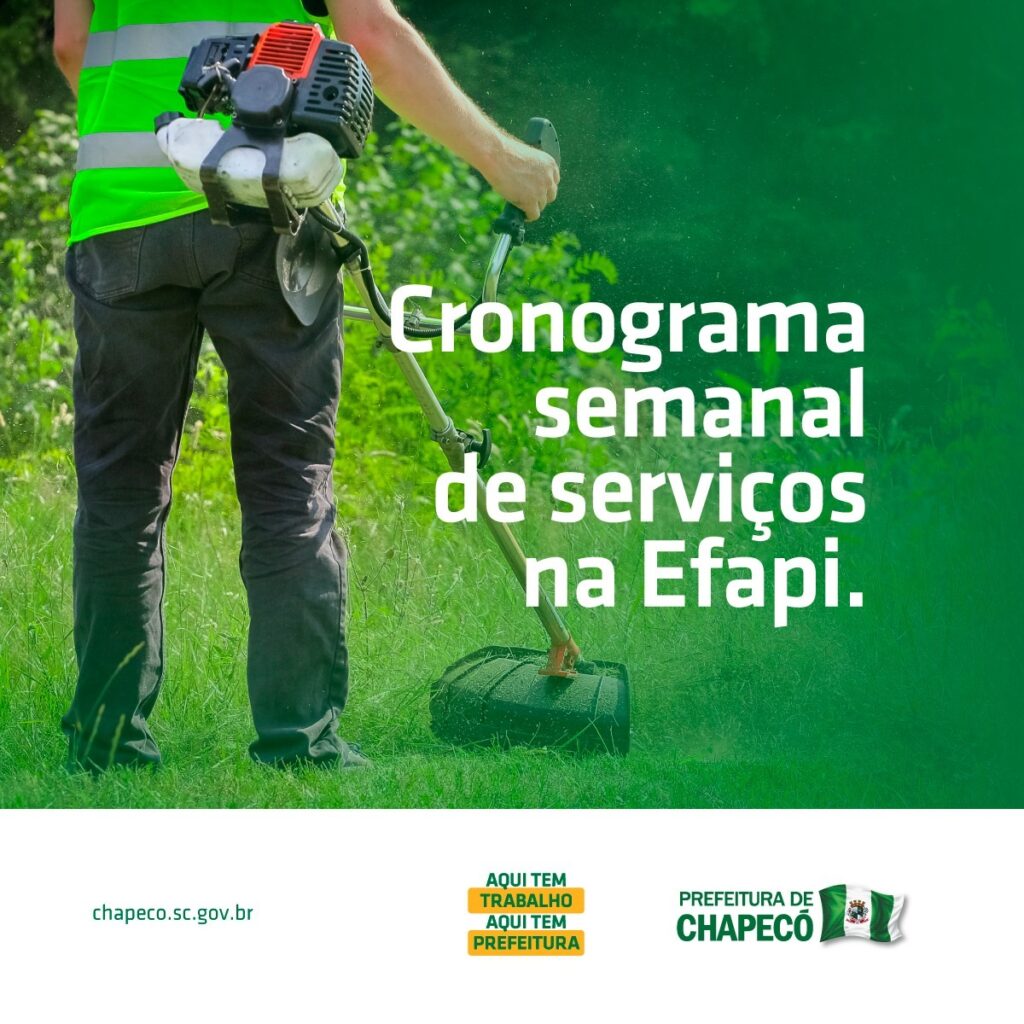 A Superintendência da Grande Efapi informa o cronograma de atividades previstas para esta semana (17 a 21 de novembro). O cronograma poderá sofrer alterações devido às condições climáticas.