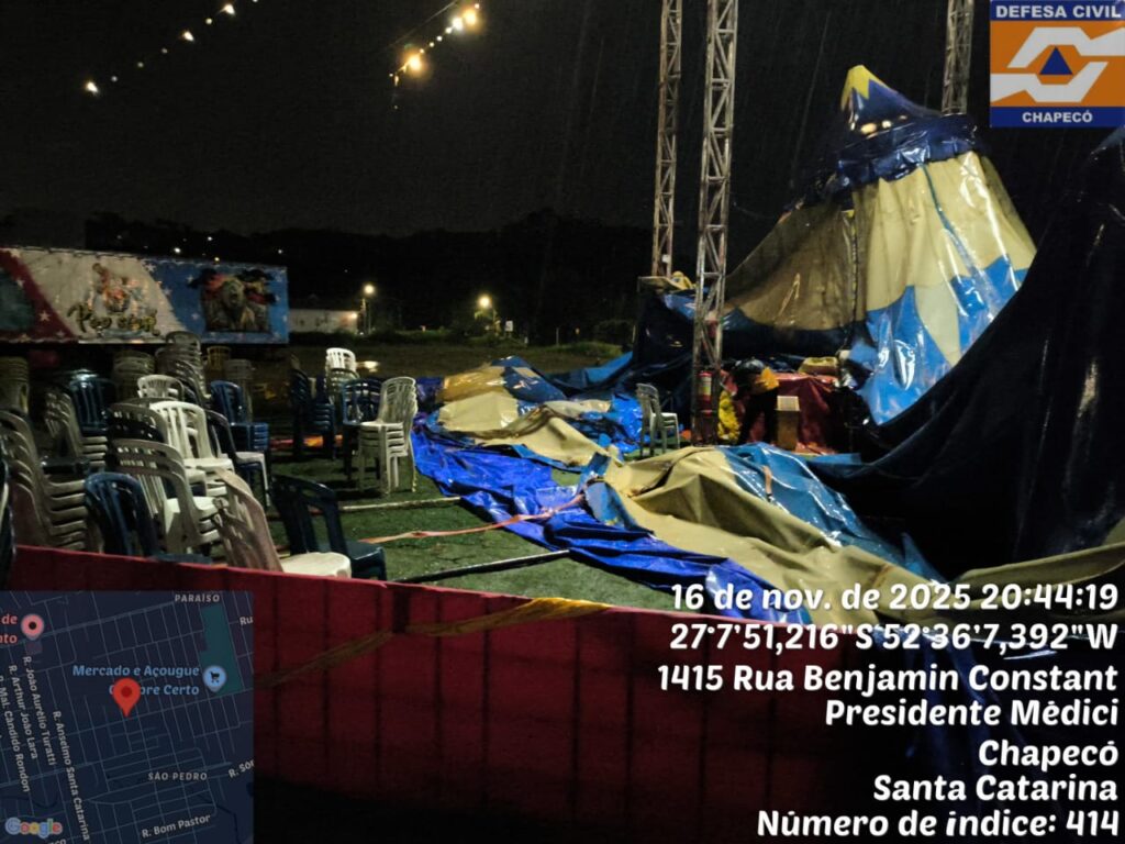 Chapecó registrou ventos moderados e chuva intensa na noite do último domingo (16), causando uma série de ocorrências em diferentes regiões da cidade. De acordo com a Defesa Civil Municipal, que atuou com três agentes durante a noite, o temporal provocou destelhamentos, quedas de árvores e o desabamento da estrutura de um circo montado na Rua Nereu Ramos. Apesar dos danos significativos, não houve registro de feridos.