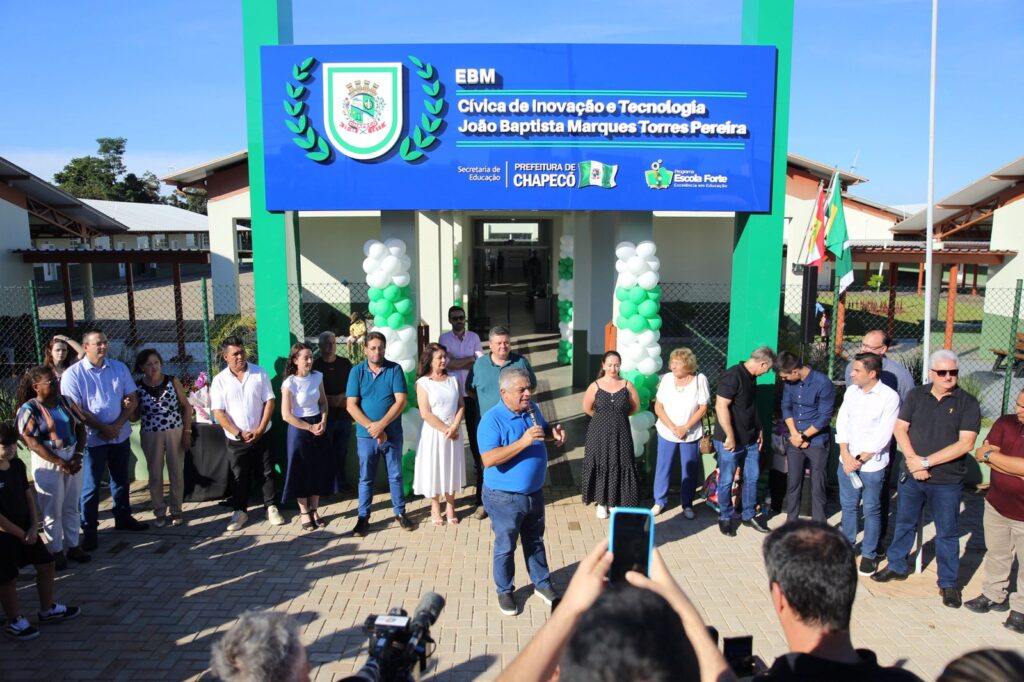 A Prefeitura de Chapecó inaugurou nesta quinta-feira (19) duas novas unidades escolares no bairro Desbravador, ampliando em mil vagas a capacidade da Rede Municipal de Ensino. Foram entregues a Escola Básica Municipal Cívica de Inovação e Tecnologia João Baptista Marques Torres Pereira e o Centro de Educação Infantil Municipal Professora Valéria Vieira Hertz, com investimento de R$ 13.378.504,30.
