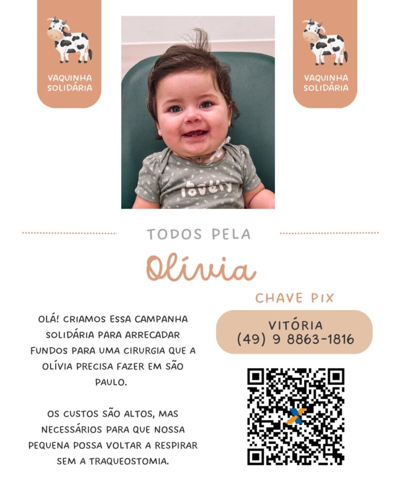 A pequena Olívia enfrenta mais um desafio em sua luta pela vida. Após uma regressão significativa no quadro respiratório, médicos indicaram exames e uma cirurgia urgente, necessários para evitar riscos ainda maiores à sua saúde. Diante da gravidade da situação, a família lançou uma campanha solidária para custear o tratamento. Segundo a família, o quadro atual representa risco de vida e exige tratamento especializado em São Paulo, com custos estimados em R$ 150 mil.