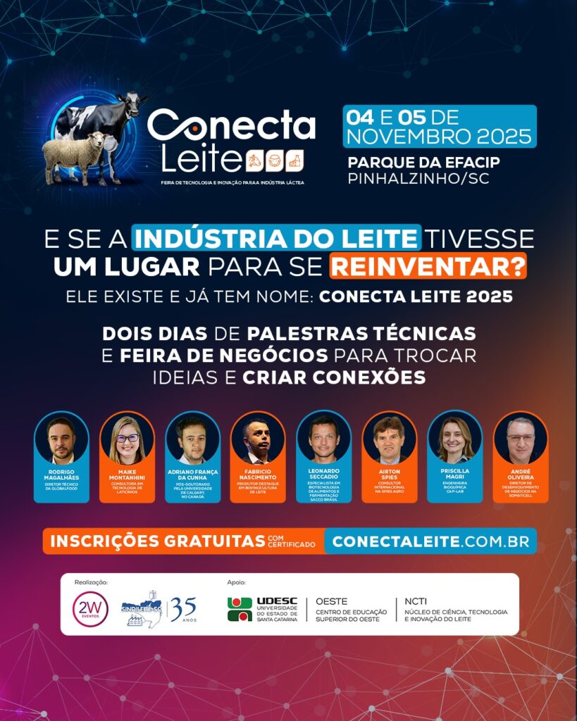 O Conecta Leite é uma realização da 2W Eventos, empresa especializada em criar projetos estratégicos e experiências de valor para o setor agro. Em parceria com o Sindileite-SC, o evento conta com o apoio do Núcleo de Ciência, Tecnologia e Inovação do Leite (NCTI), da Udesc Oeste, do Governo do Estado de Santa Catarina, com promoção da Prefeitura de Pinhalzinho (SC).