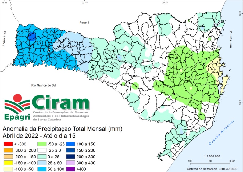 Vale salientar que a chuva registrada na primeira quinzena de abril ficou próxima e acima da média climatológica em boa parte do Estado, como mostra a Figura 1. Apenas na região que aparece em tons de verde claro e bege no mapa, os totais de precipitação ainda estão abaixo do esperado para abril. No entanto, com a previsão para o restante do mês, a chuva de abril deve ficar acima da média em todas as regiões de SC. (Fonte: Epagri Ciram)