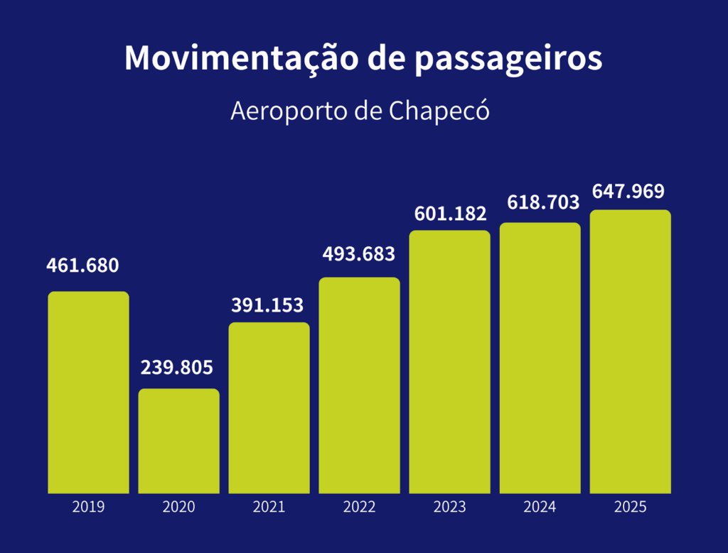 O Aeroporto de Chapecó, no Oeste de Santa Catarina, vem registrando recordes consecutivos de movimentação desde a conclusão de seu processo de ampliação e modernização, realizado com recursos próprios da concessionária. Com quase 648 mil passageiros embarcados e desembarcados, o empreendimento alcançou, ao longo de 2025, a maior movimentação de sua história que, além de representar um novo recorde, supera em 4,7% o fluxo registrado em 2024, quando foram atendidos 618,7 mil viajantes, maior marca até então. O número histórico foi atingido ainda em meados do mês de dezembro.