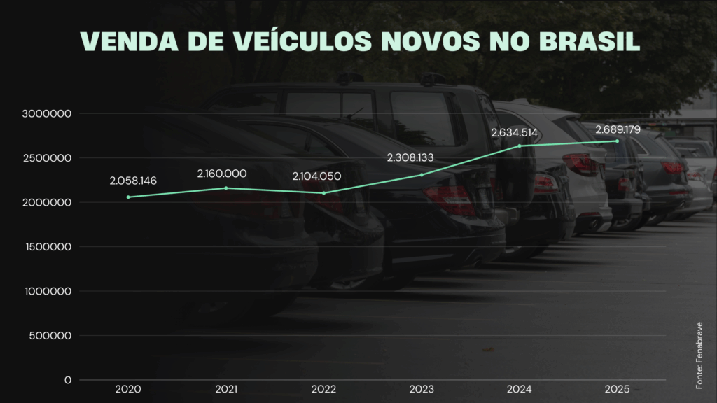 Ao ampliar a visão para todos os segmentos, o resultado anual apresenta outro número de referência. Somando automóveis, veículos comerciais leves, caminhões e ônibus, o Brasil atingiu em 2025 um total de 2.689.179 veículos novos vendidos. A diferença em relação ao número de 2,54 milhões responde ao alcance das categorias consideradas em cada medição. Sob essa metodologia mais ampla, o mercado também apresentou melhora e registrou o melhor nível desde 2019, quando foram matriculadas cerca de 2,78 milhões de unidades. Em termos comparativos de longo prazo, o volume de 2025 ficou cerca de 100.000 unidades abaixo daquele pico pré-pandêmico.