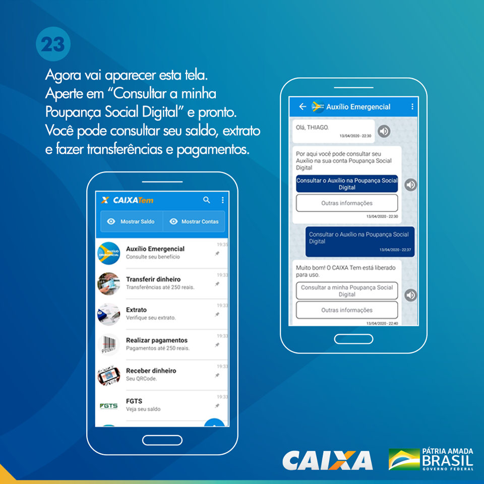 Os beneficiários do Auxílio Emergencial do Governo Federal, que não possuem contas na Caixa Econômica, terão contas digitais abertas pela financeira para o recebimento do valor. Para aqueles que forem considerados aptos o dinheiro será depositado na Poupança Digital CAIXA, que poderá ser movimentada pelo aplicativo CAIXA Tem, disponível nas lojas de aplicativos Google Play e App Store.