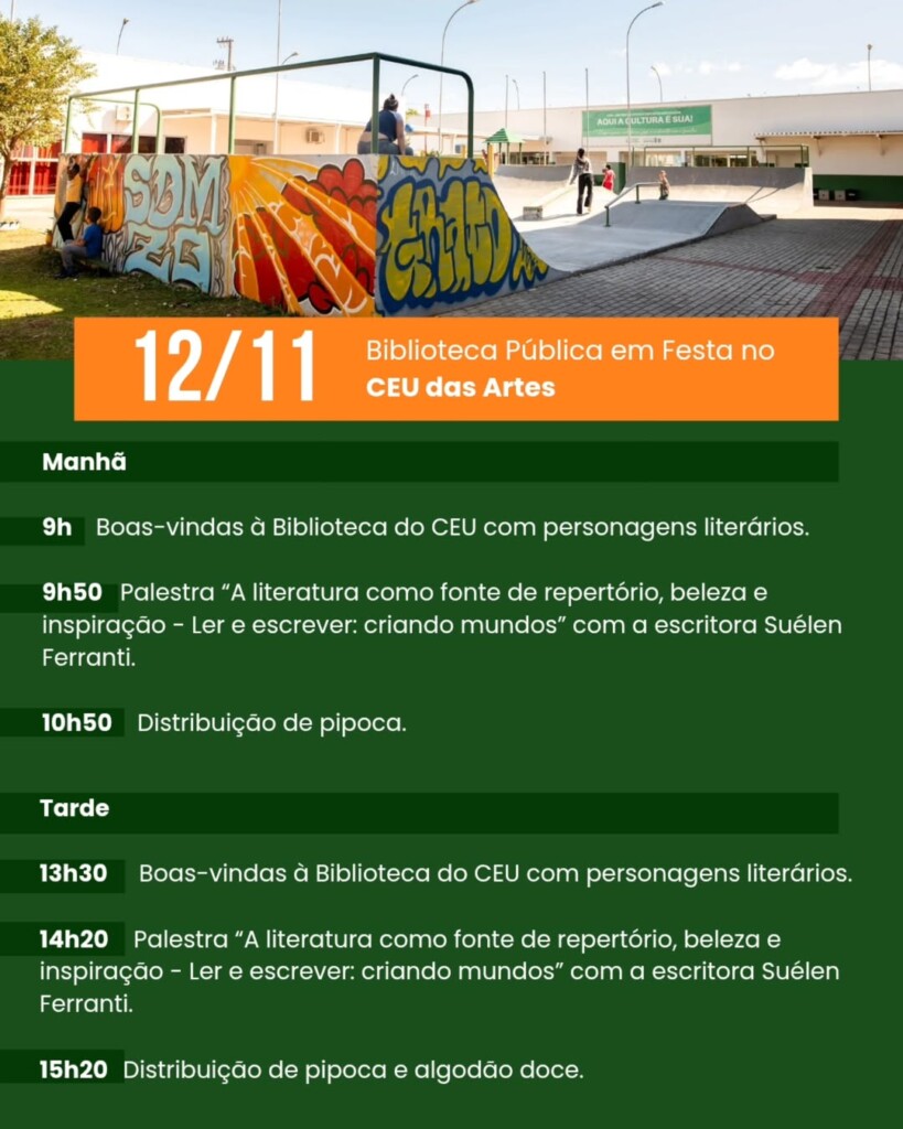 No dia 12 de novembro, a festa acontece na Biblioteca do CEU das Artes, no bairro Efapi, a partir das 9h. O público será recebido por personagens literários, e a manhã contará com a palestra “A literatura como fonte de repertório, beleza e inspiração – Ler e escrever: criando mundos”, ministrada pela escritora Suélen Ferranti. À tarde, as atividades recomeçam às 13h30, com repetição da palestra e nova recepção temática. A distribuição de pipoca garantirá o clima descontraído da celebração.