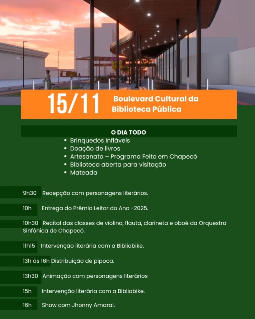 Já no dia 15 de novembro, o Boulevard Cultural da Biblioteca Pública será o palco das festividades, a partir das 9h30, com recepção temática e diversas atrações. Às 10h, ocorre a entrega do Prêmio Leitor do Ano 2025, que homenageia os leitores mais assíduos da instituição. Logo após, às 10h30, o público poderá prestigiar o Recital da Orquestra Sinfônica de Chapecó, com apresentações de violino, flauta, clarineta e oboé. O dia segue com intervenções literárias da Bibliobike, animações com personagens, artesanato do programa Feito em Chapecó, mateada, doação de livros, e show de encerramento com o cantor Jhonny Amaral, às 16h.