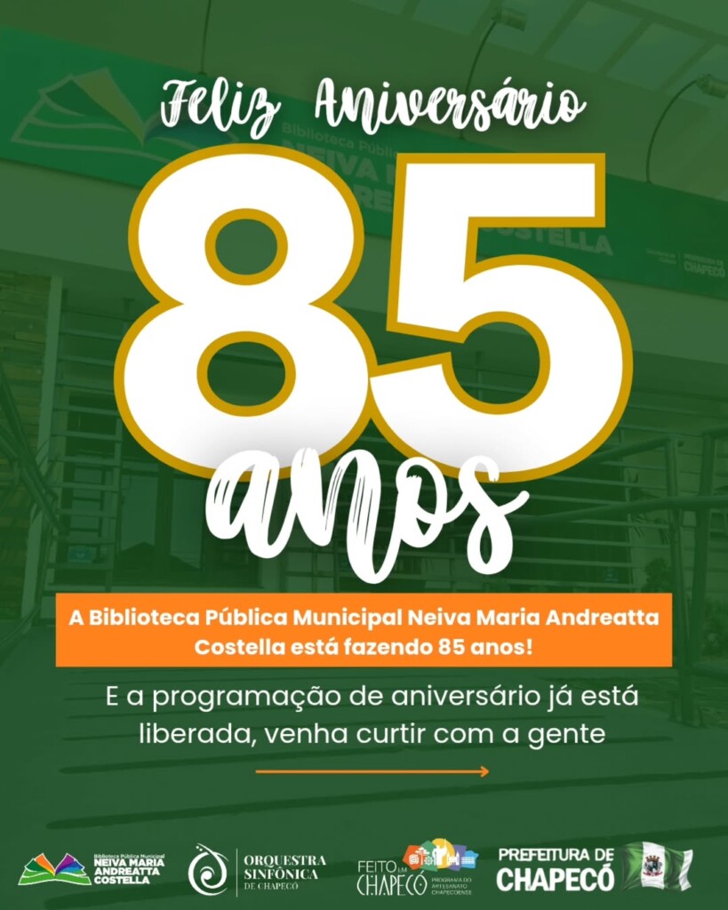 A Biblioteca Pública Municipal Neiva Maria Andreatta Costella completa 85 anos de história e celebra a data com uma programação especial voltada à comunidade chapecoense. As comemorações ocorrem nos dias 12 e 15 de novembro, com atividades gratuitas que destacam o papel da instituição como um dos principais espaços de incentivo à leitura, à cultura e ao convívio social na cidade.